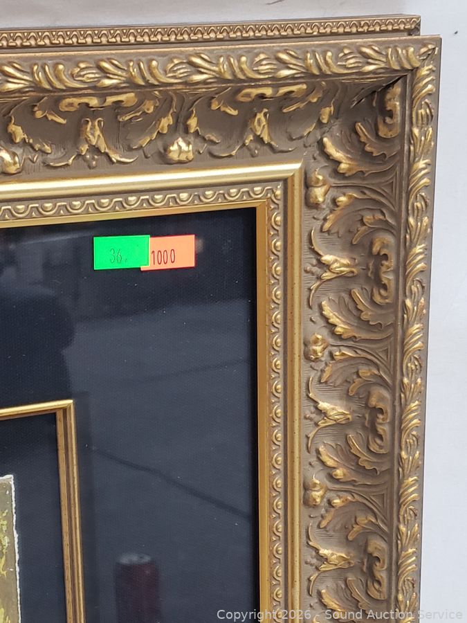 26" x 23". Gold gilt framed with glass.