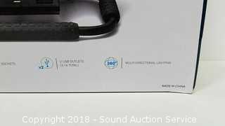Has powerstrip and USB charging ports. Tested, works. Refer to photos for more information.