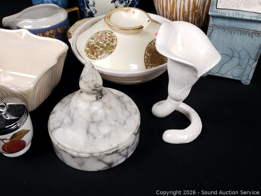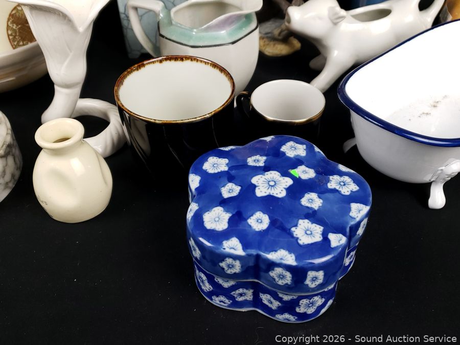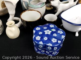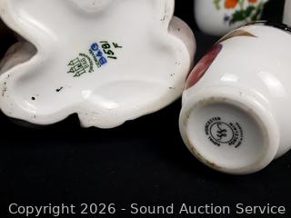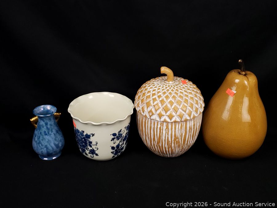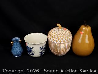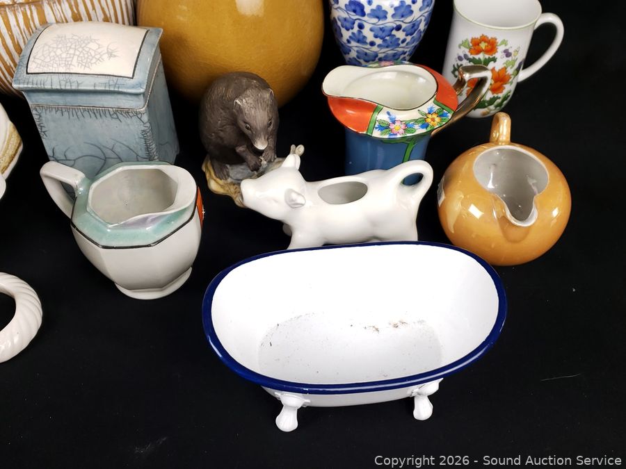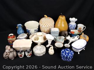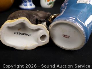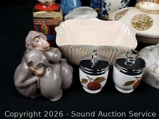 Creamers, vases, porcelain monkey figure, acorn & pear figures, etc. Refer to photos for lot contents, more details.