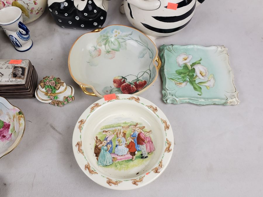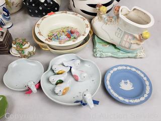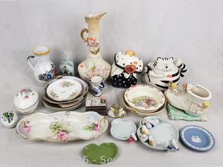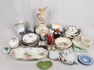 Plates, saucers, teapot, trinket boxes, Wedgwood dish, etc. Refer to photos for lot contents, more details.