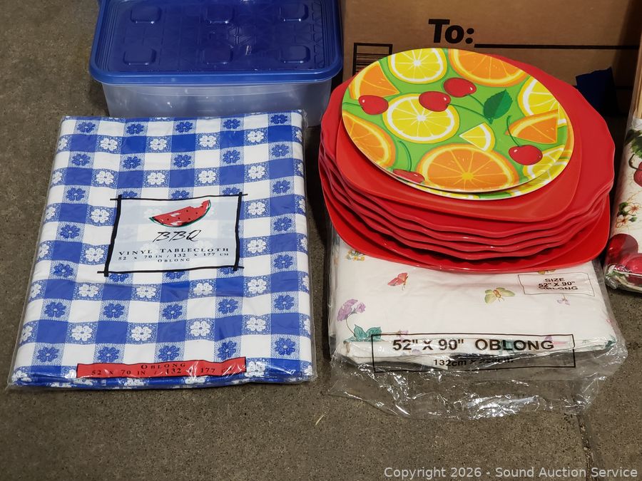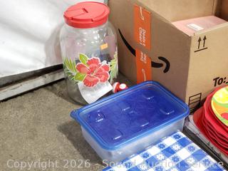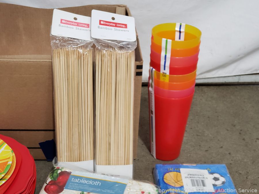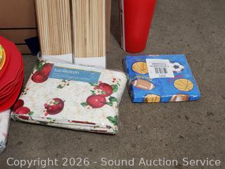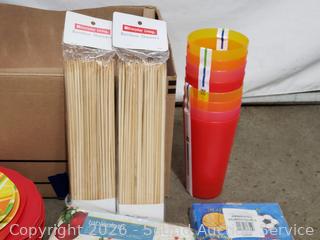 Drink dispenser, tumbler cups, plastic plates, wood skewers, tablecloths, etc. Refer to photos for lot contents, more details.