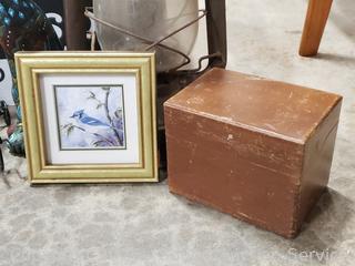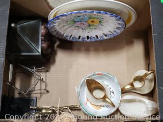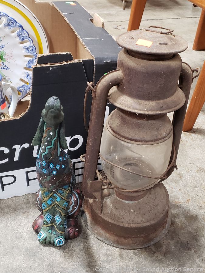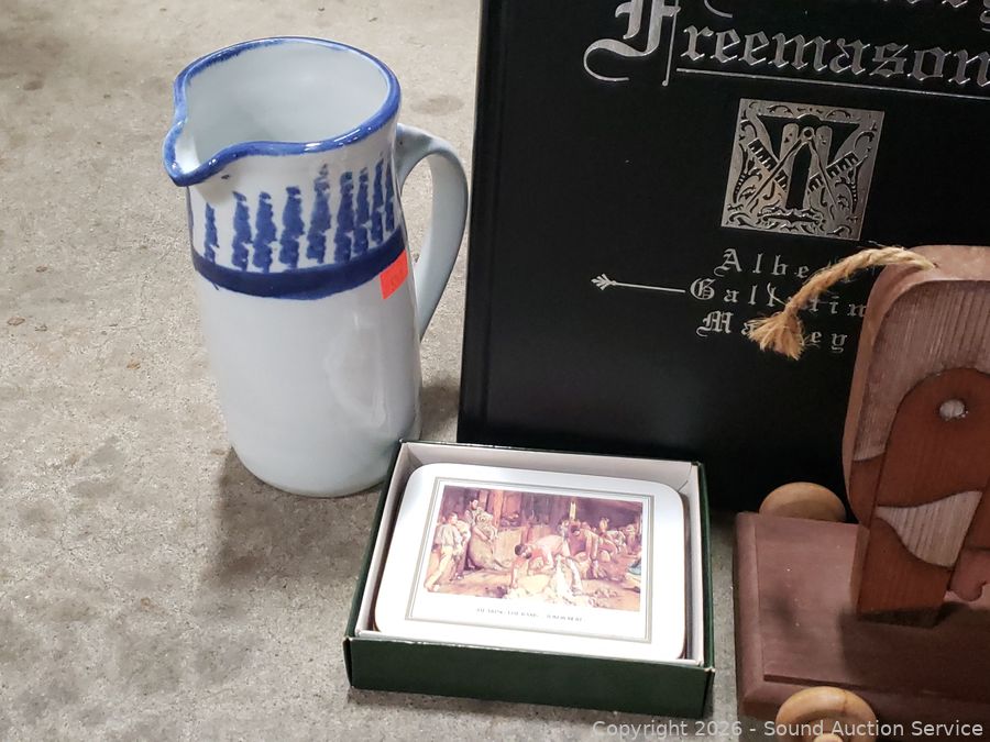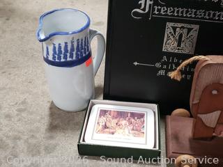 "The History of Freemason" book, cast-iron bookend, rustic barn lantern, ivory & gold cream/sugar, picture stands, etc.
