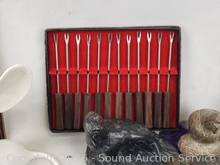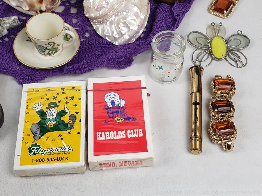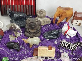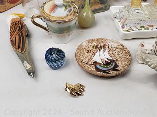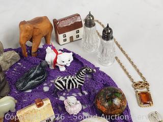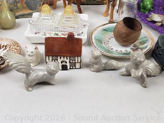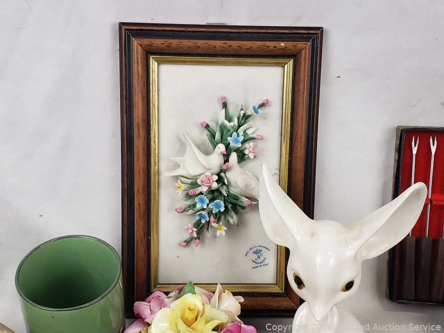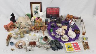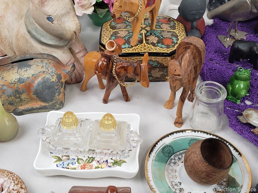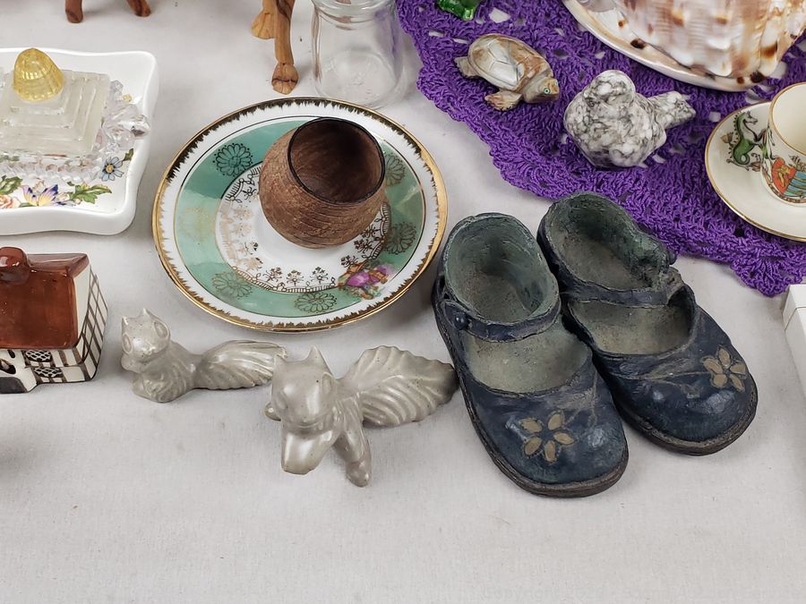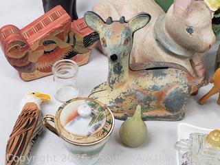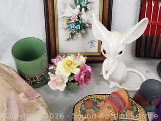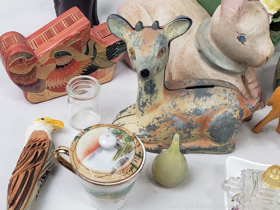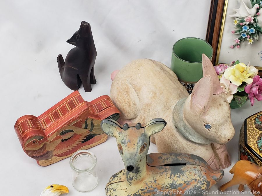 Capodimonte plaque, carved wood rabbit figure, porcelain mouse, metal deer coin bank, porcelain floral arrangement (some chips, damage), carved wood figures, seashells, salt/pepper, etc. Refer to photos for lot contents, more details.