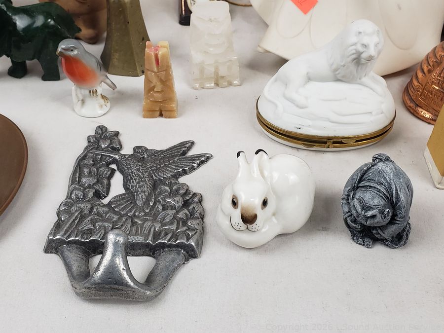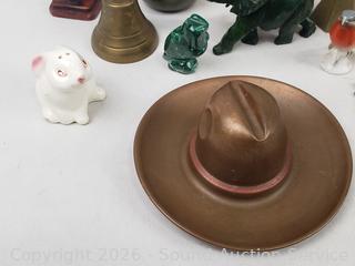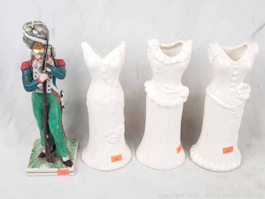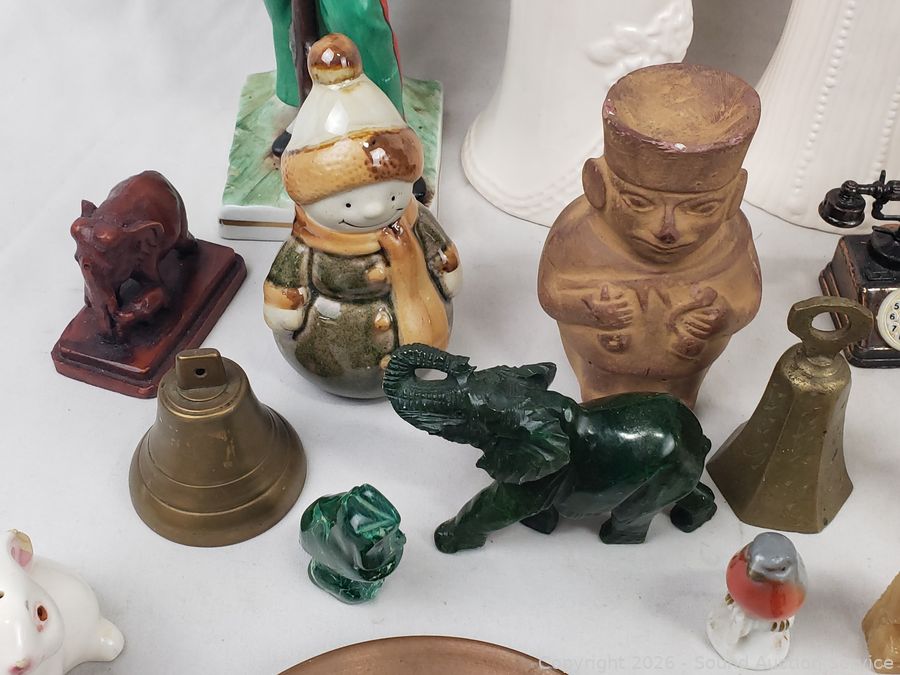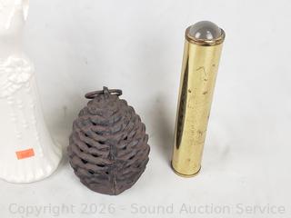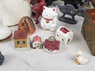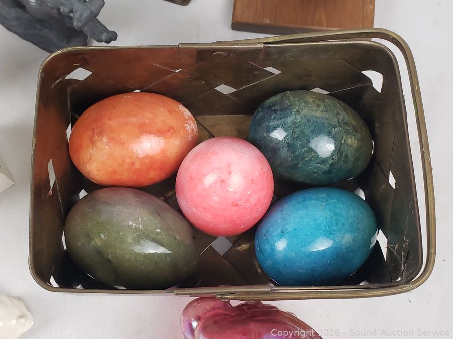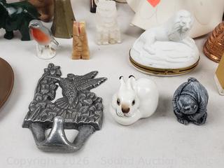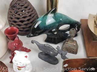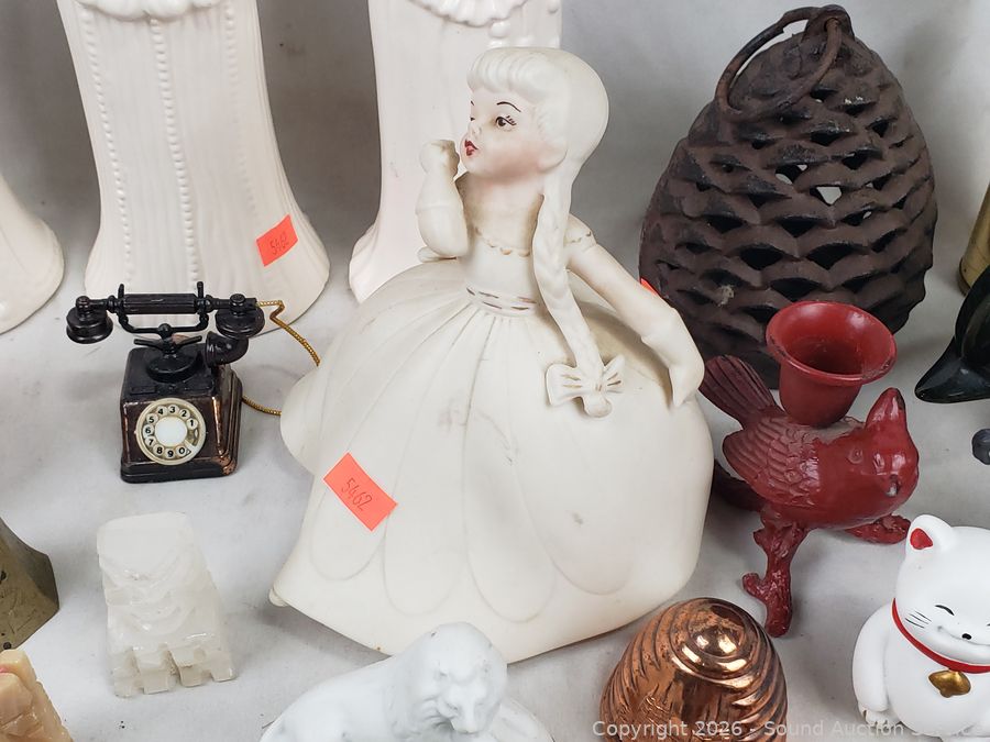 Porcelain dress vase decor, Kaleidoscope, porcelain figures, cast iron fairy light lantern, stone eggs, etc. Refer to photos for lot contents, more details.