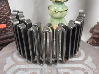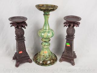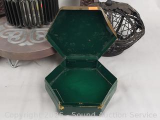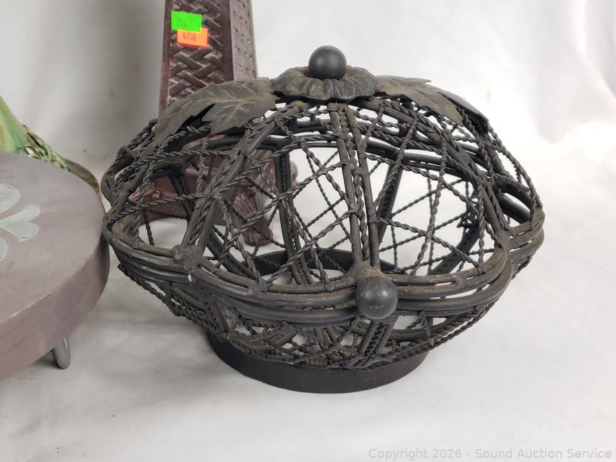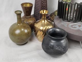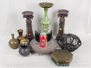 Vases, candleholders, metal woven basket, etc. Refer to photos for lot contents, more details.