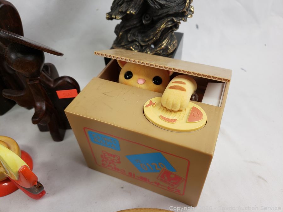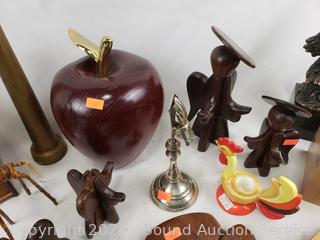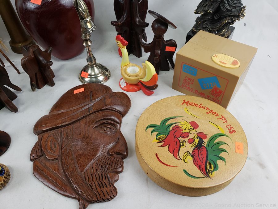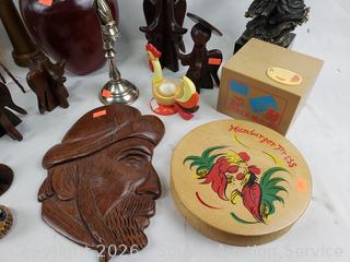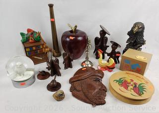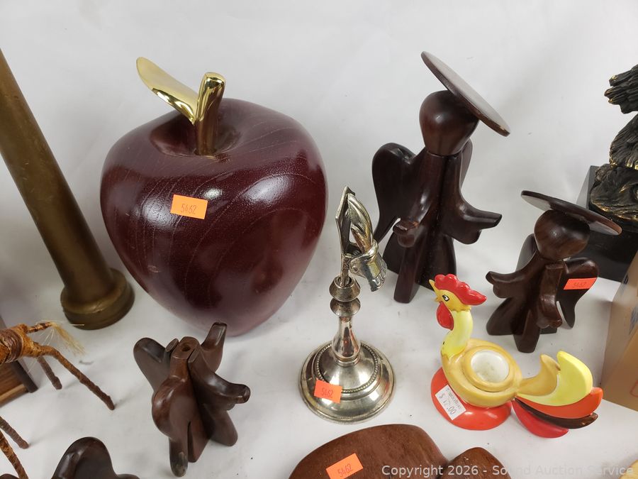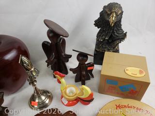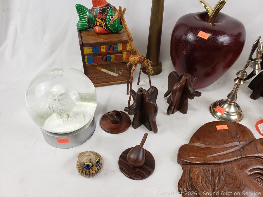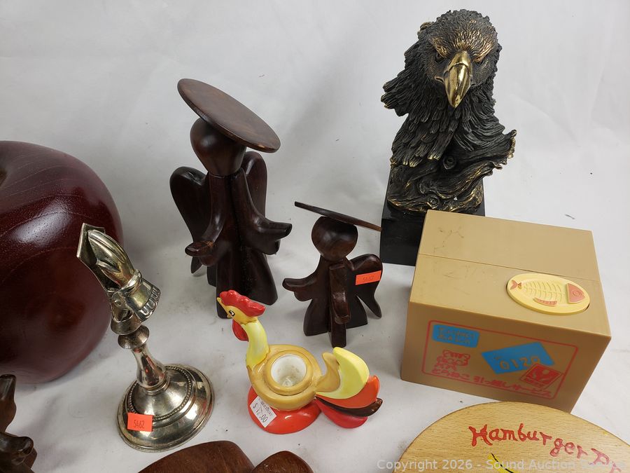 Owl snowglobe, vintage fire hose nozzle, wood figures, eagle sculpture, etc. Refer to photos for lot contents, more details.