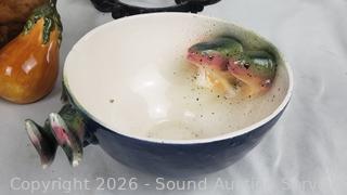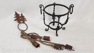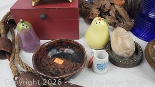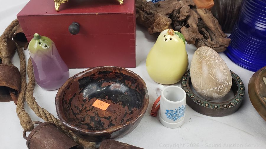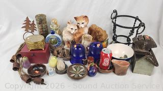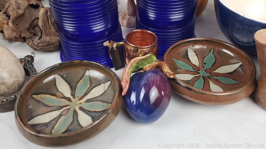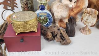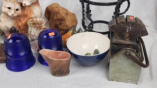 Cat sculpture, stone goblets decor, glass insulators, wrought iron potholder, pottery bowls, trinket boxes, etc. Refer to photos for lot contents, more details.