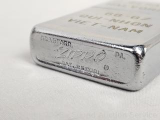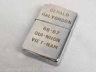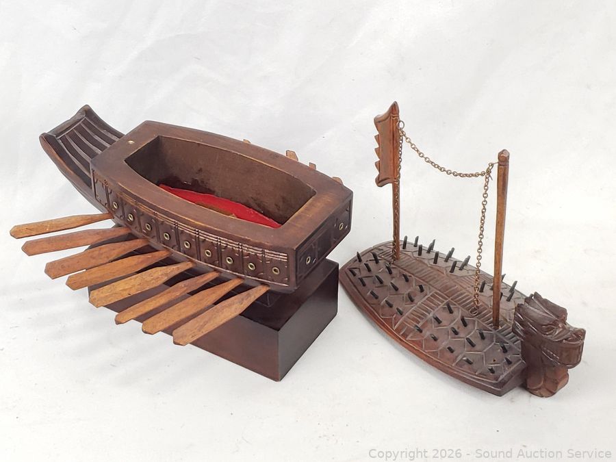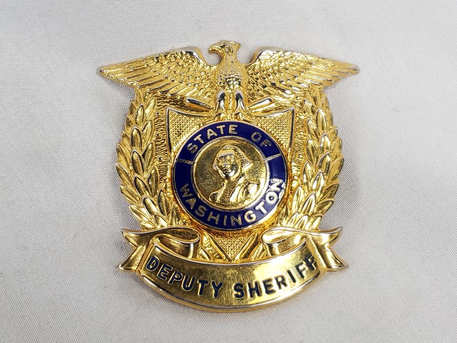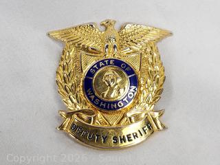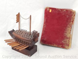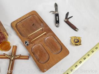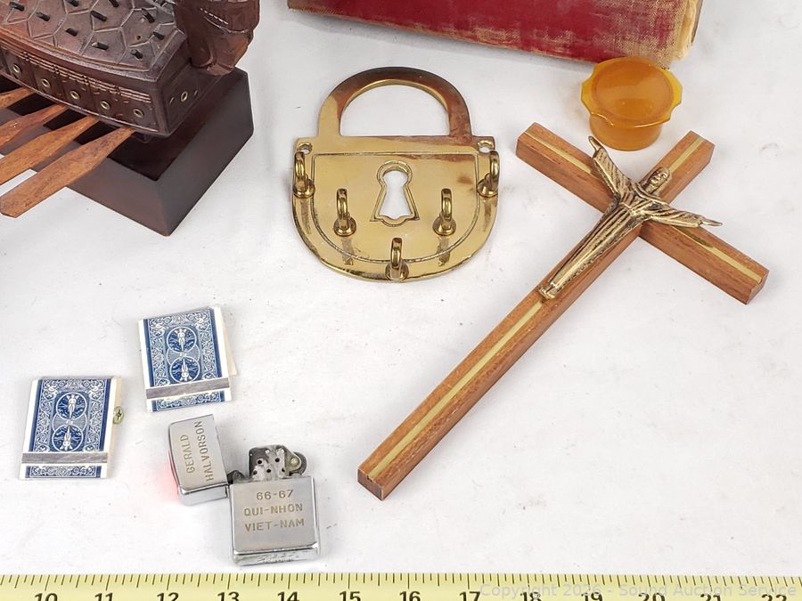 Replica Turtle Ship trinket box, antique photo album, 1965 Vietnam War Zippo, brass key rack, Kamp-King pocketknife, crucifix, State of Washington Deputy Sheriff badge, etc. Refer to photos for lot contents, more details.