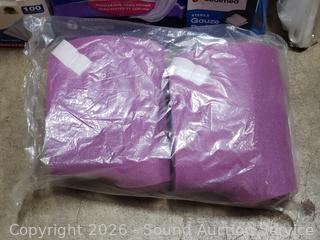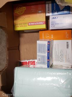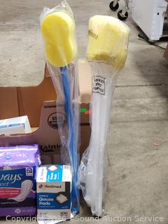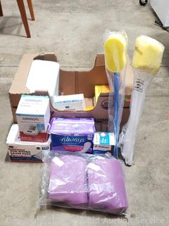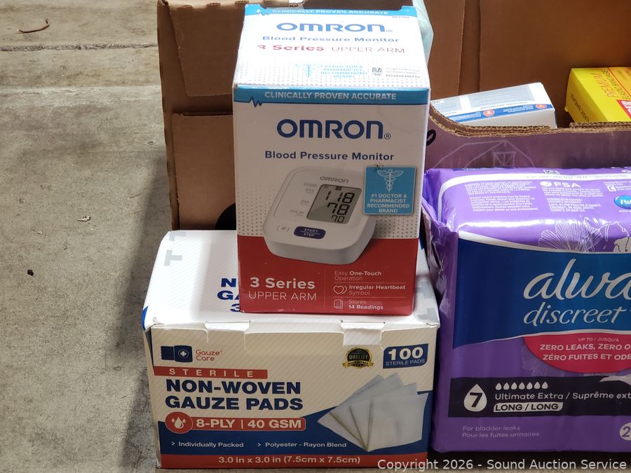 Heel protectors, 3x3|2x3|2x2 gauze pads, Omron blood pressure cuff, bath sponges, elastic bandages, always pads, disposable bed pads, etc. Refer to photos for lot contents, more details.