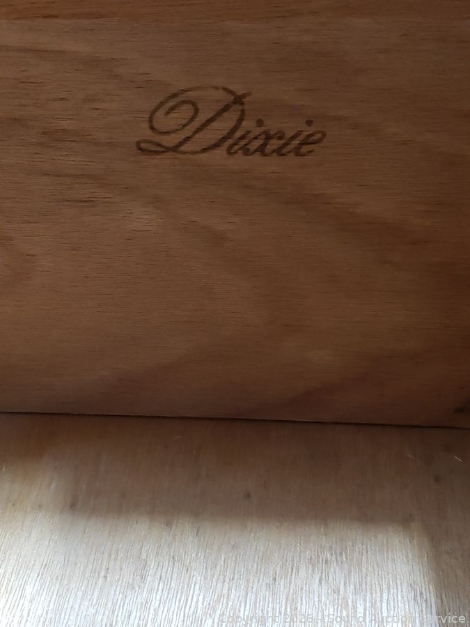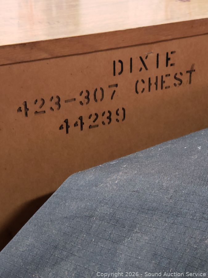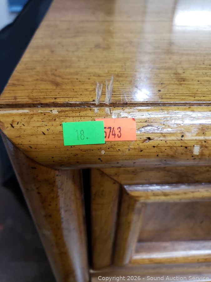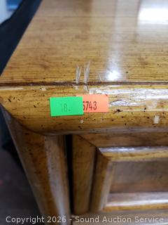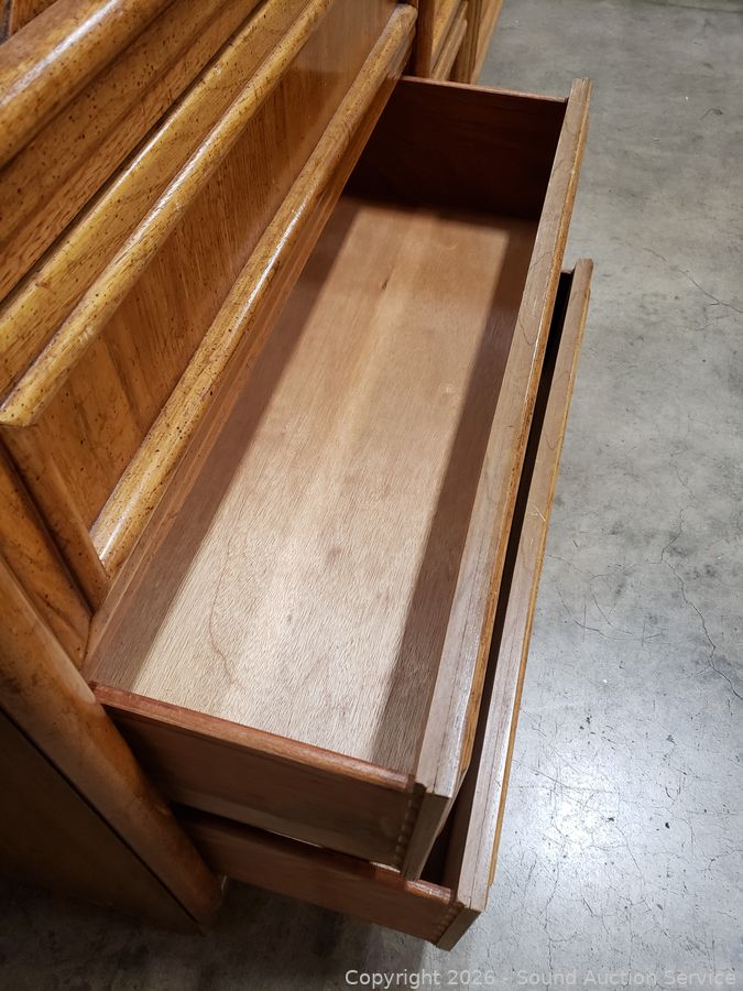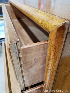 Dovetail joinery, wood fronts, veneer finish, particleboard construction. Some scuffs, burn spots on the top. Matches the previous lot. 48" H x 36" W x 19.25" D.