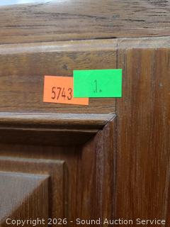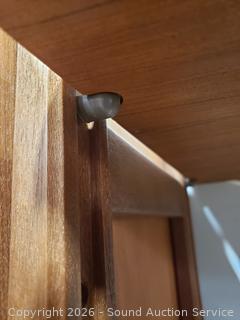 Appears to be solid teak construction. Can be setup however you want. Some scuffs dings along shelf edges, overall great condition. 4 cabinets,1 drawer, 6 shelves. Hard to get the bottom right cabinet to open. 72" H x 76" W x 16" D.