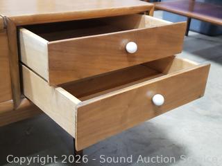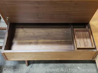 2-drawers, lift-top storage, with tray. Some scuffs, wear to finish. Lift top hinges are loose. 16.25" H x 46" x 32".