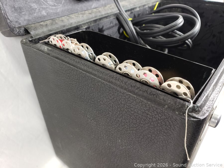 Appears to be functioning as intended. Complete with manual, foot pedal, bobbins, attachments, case. In great condition.
