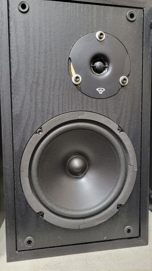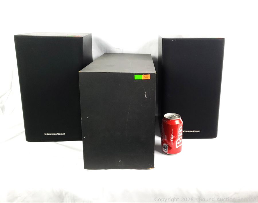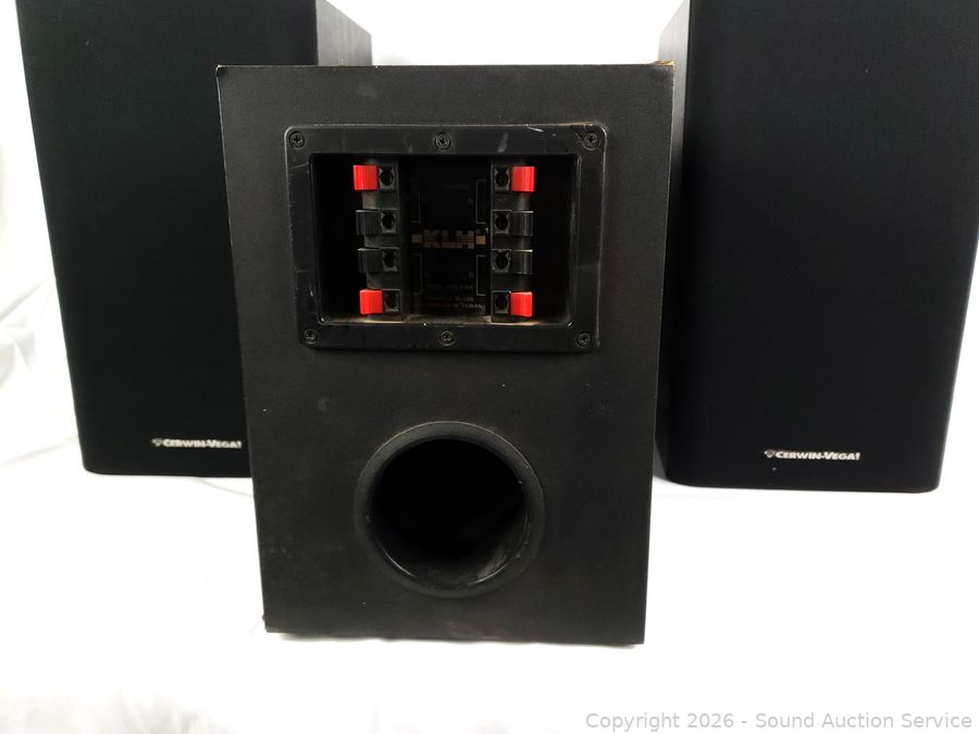 Cerwin Vega are passing sound with signal test, one is missing port tube, some cracks in tweeters plastic surrounds. KLH speaker is untested, consignor said it works. 11" H x 7.75" x 17" & 14" H x 8.25" W x 9" D. Some scuffs, wear to finish.