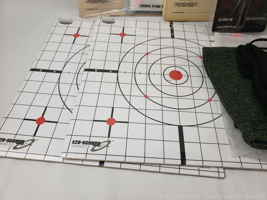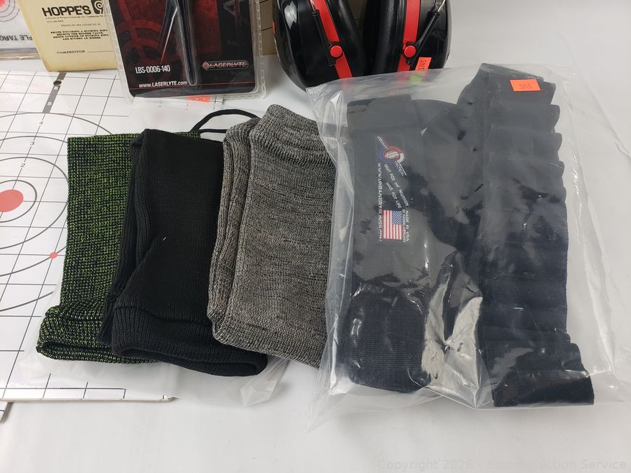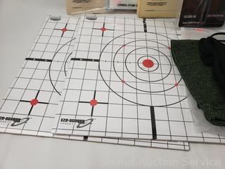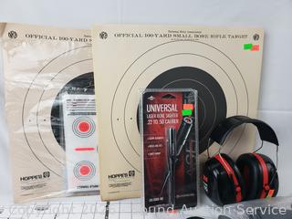 Laser Bore Sighter, Ear Protection, 3 Knitted Rifle Sleeves, Targets, Shotgun Bandolier, etc. Refer to photos for lot contents, more details.