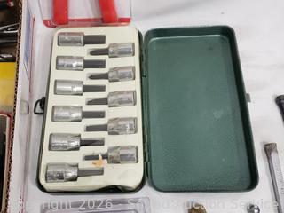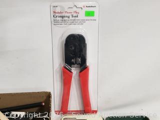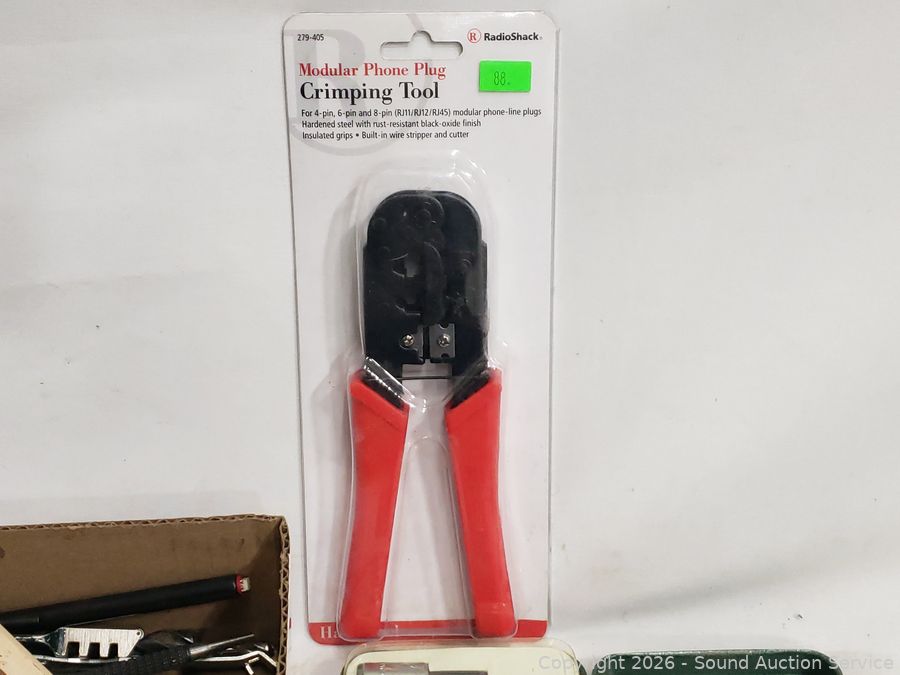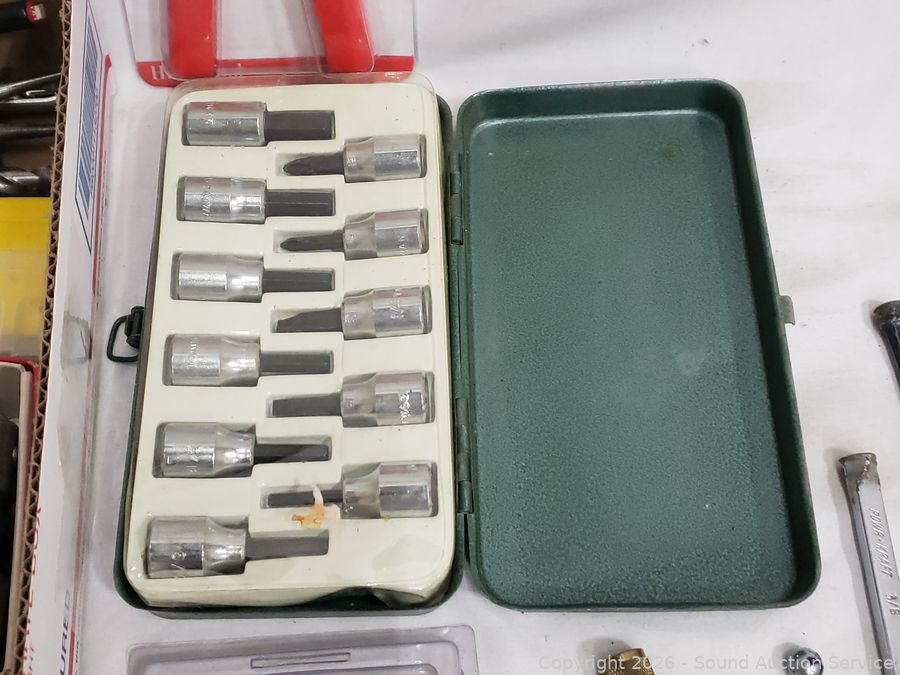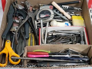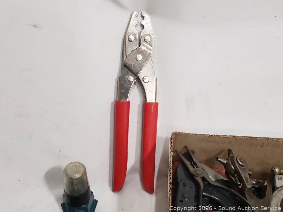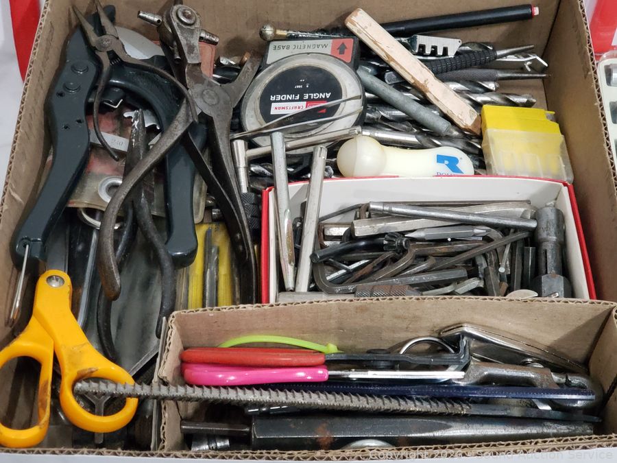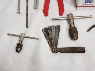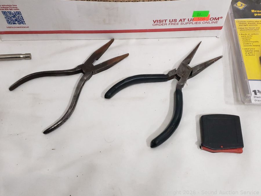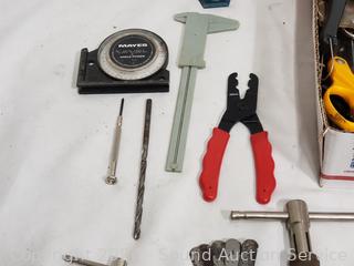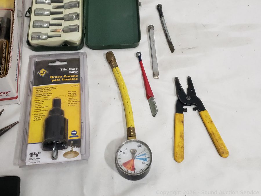 Hole saw bit, crimping tool, hex keys, needle nose plyers, rasp, etc. Refer to photos for lot contents, more details.