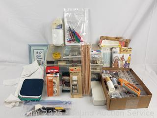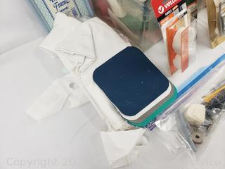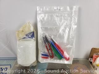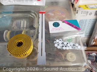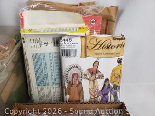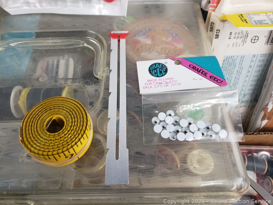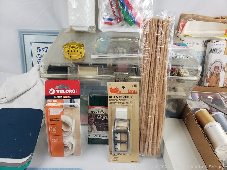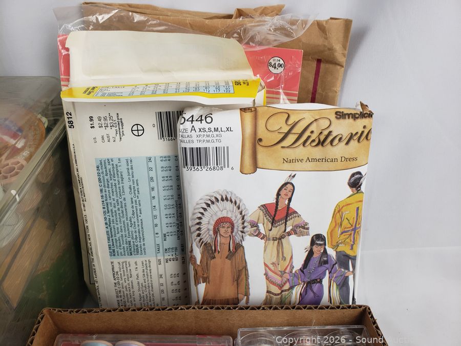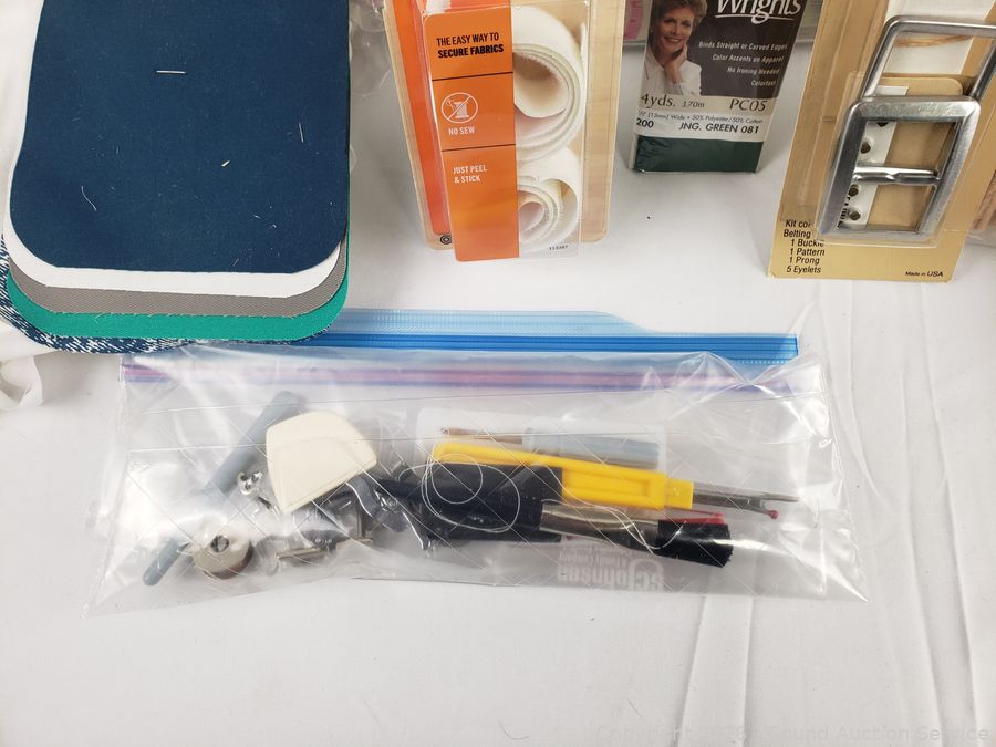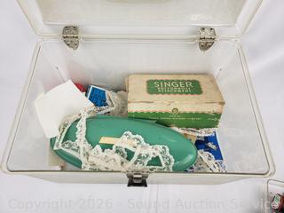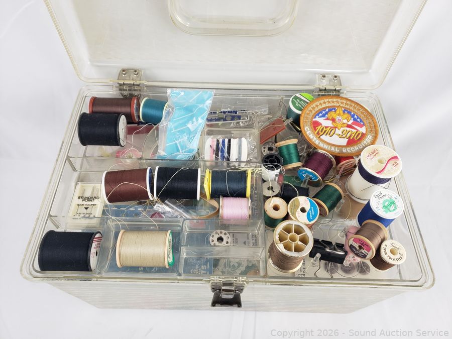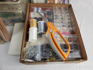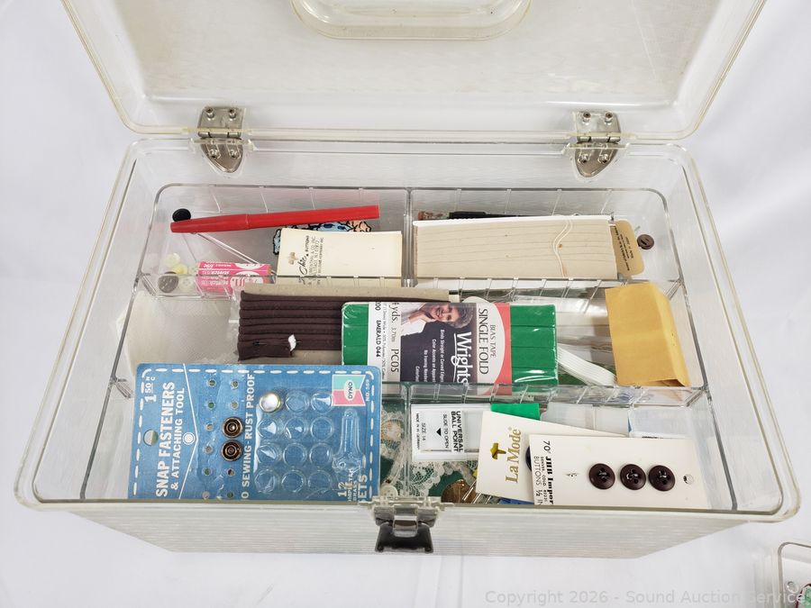 Bobbins, thread, case full of supplies, scissors, patterns, etc. Refer to photos for lot contents, more details.