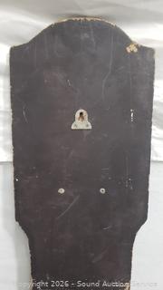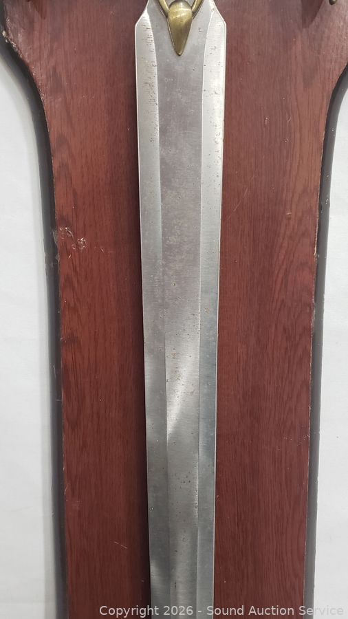 Various rust spots on blade of sword, scuffs wear to finish of display. Approx. 37" length sword, 43" x 9" display.