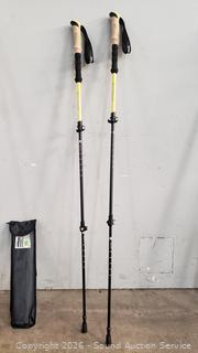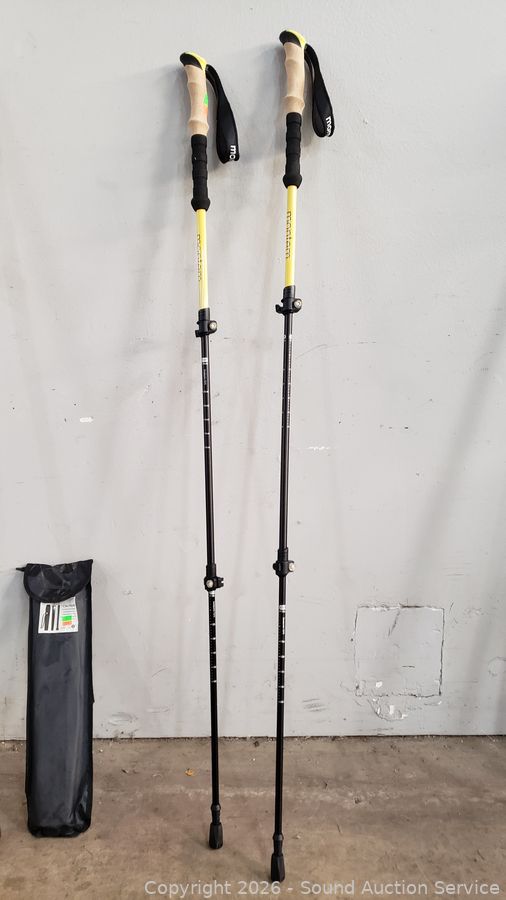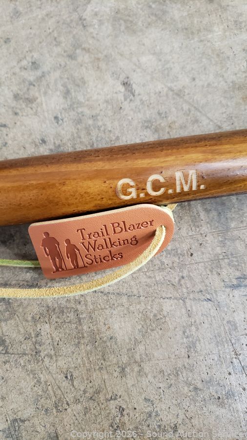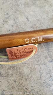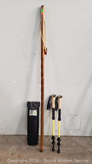Wood 55" embossed "G.C.M." by Trail Blazer Walking Sticks, Wood 3pc 54" with storage bag, 2 Montem Telescopic poles. All in great condition.
