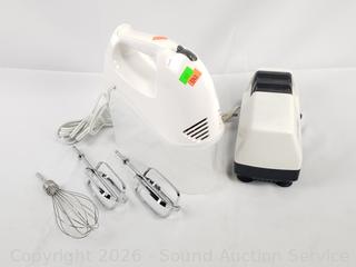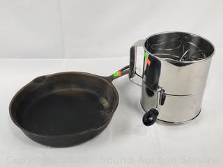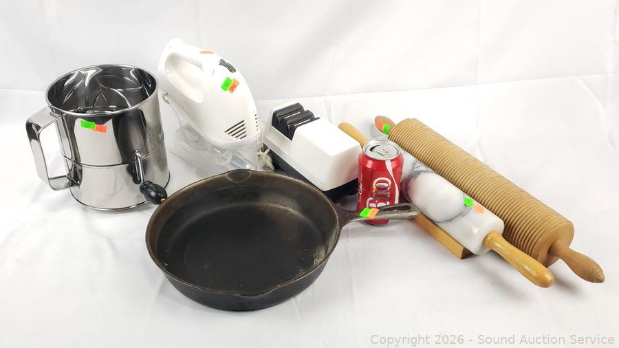 Chef's Choice 300 Electric Sharpener, Proctor Silex Mixer, Sifter, 10.5" Cast Iron Skillet, Marble & Wood Rolling Pins.