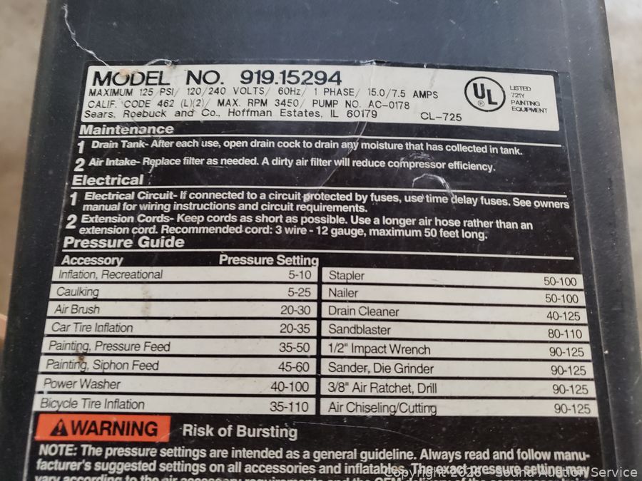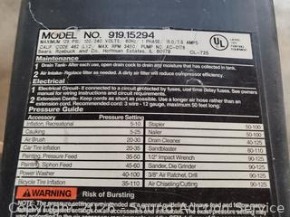 Comes with air hose. Model 919.15294. 120V plug. In great condition. 29" H x 40" x 19" overall.