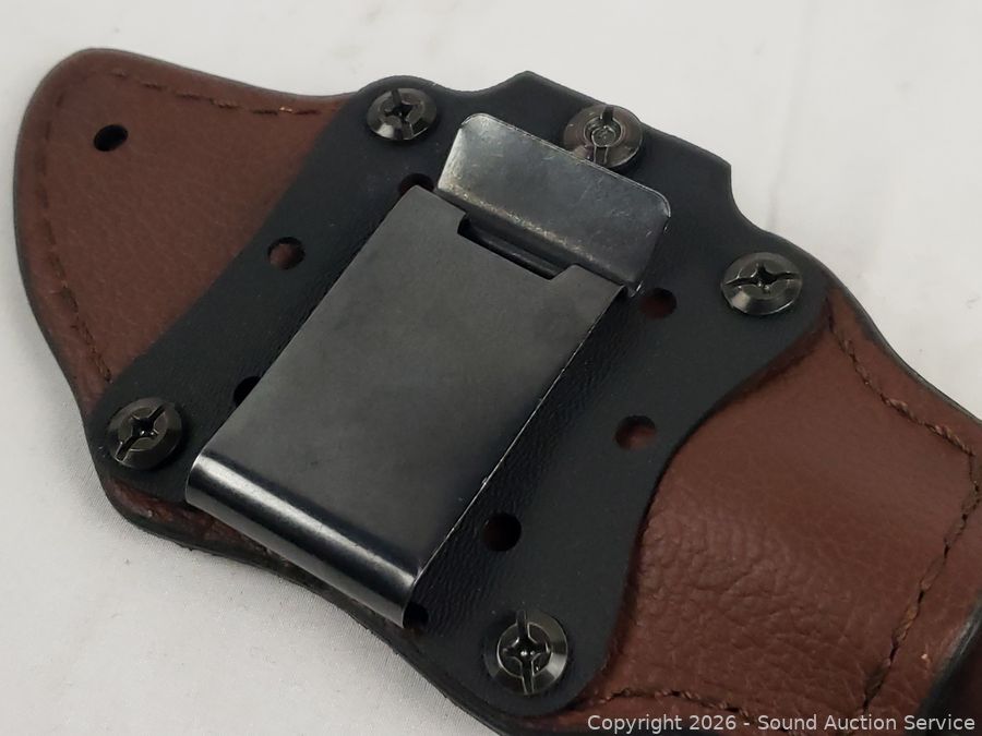 Horizontal belt clip leather sheathe. Knife and sheathe, both are very well made. 8.5" length, 4" blade.