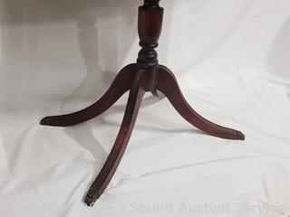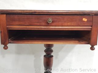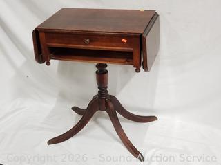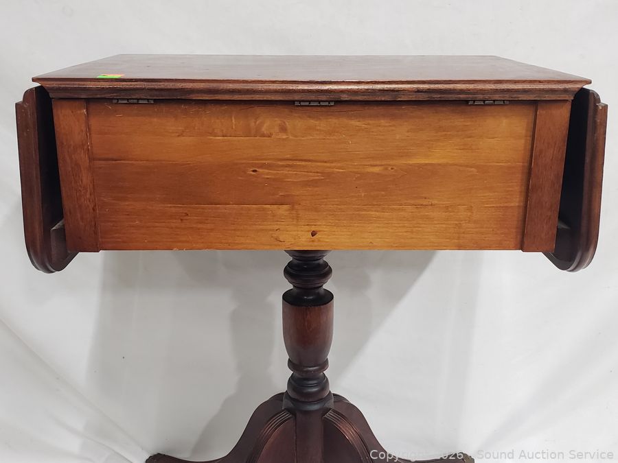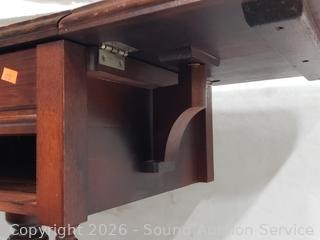 28" H x 22" W x 14" with (2) 7.5" drop leaves. 16 small spoons, 6 large spoons, 6 large forks, 4small forks, 5 butter knives, 2large serving spoons, teaspoon, spreader.