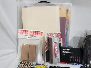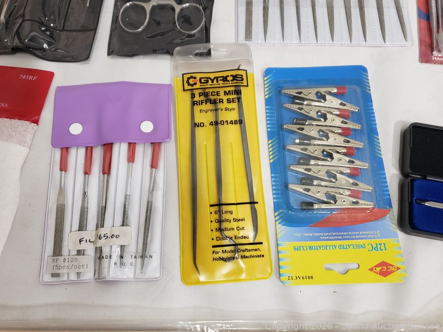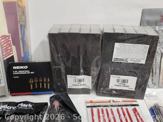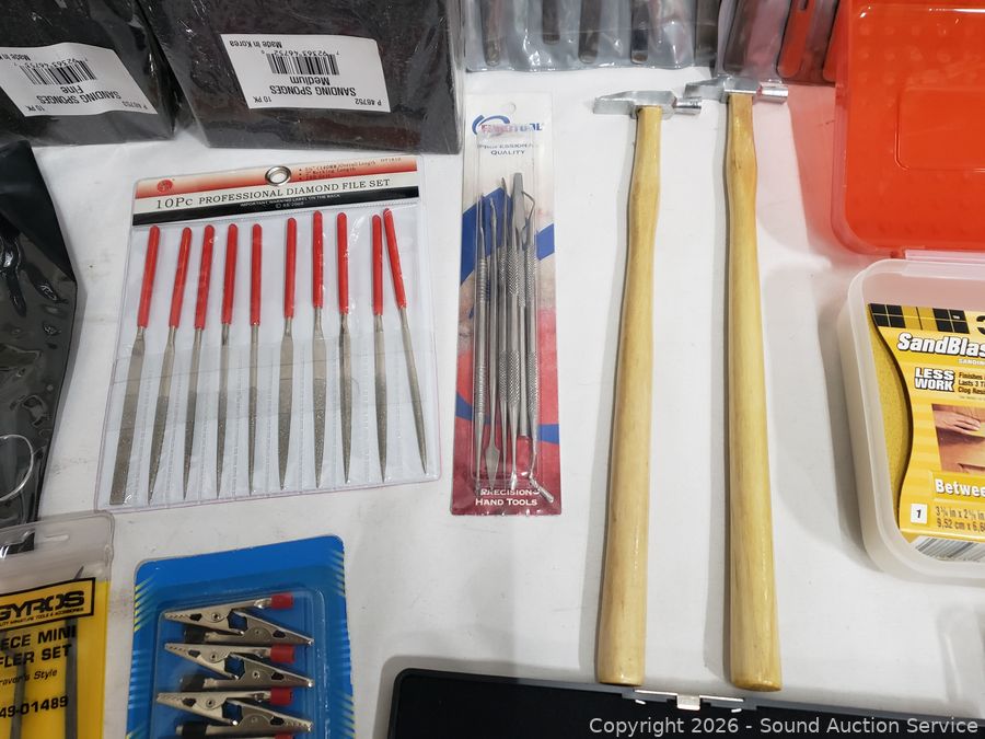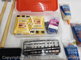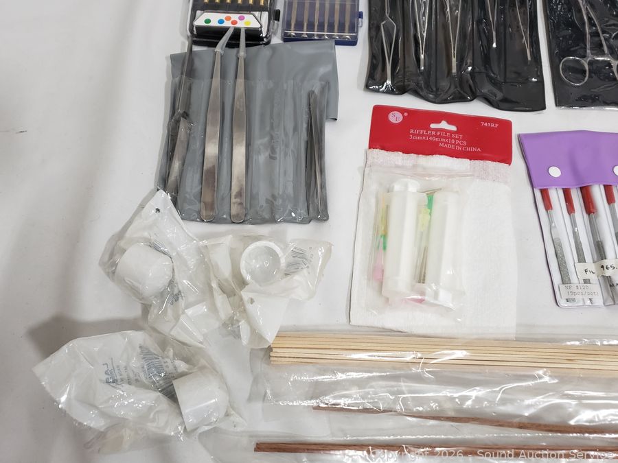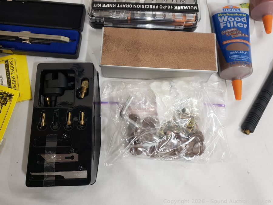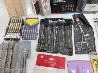 Sanding Blocks, Mulwark 16pc Precision Craft Knife Kit, Assorted Riffler Files, Alligator Clips, Calmp Tools, Tweezer Sets, Counter Sink Bit Set, Divider Set, Wood Filler, Precision Screwdriver Set, etc. Refer to photos for lot contents, more details.