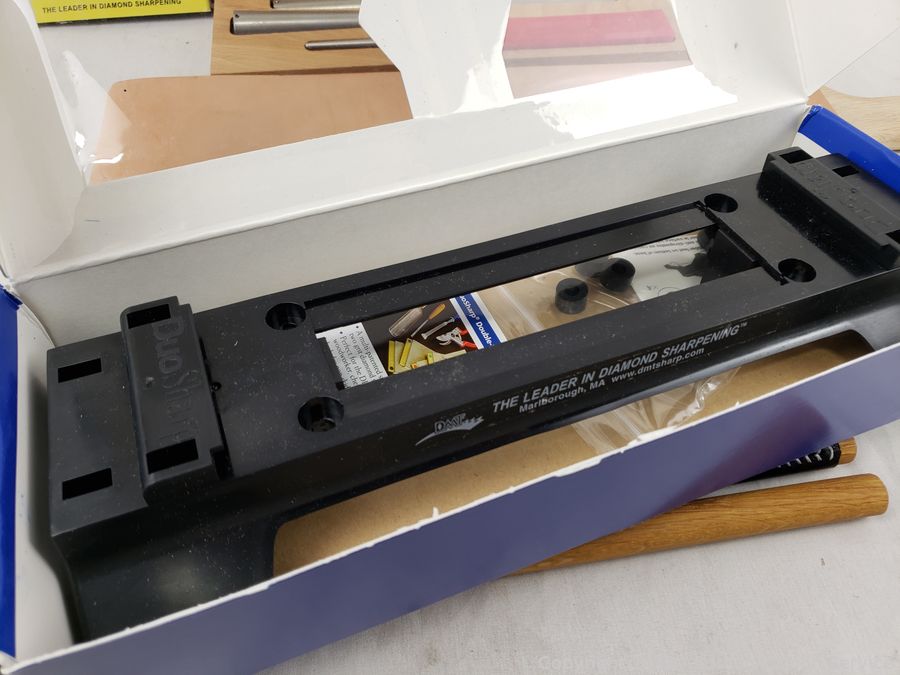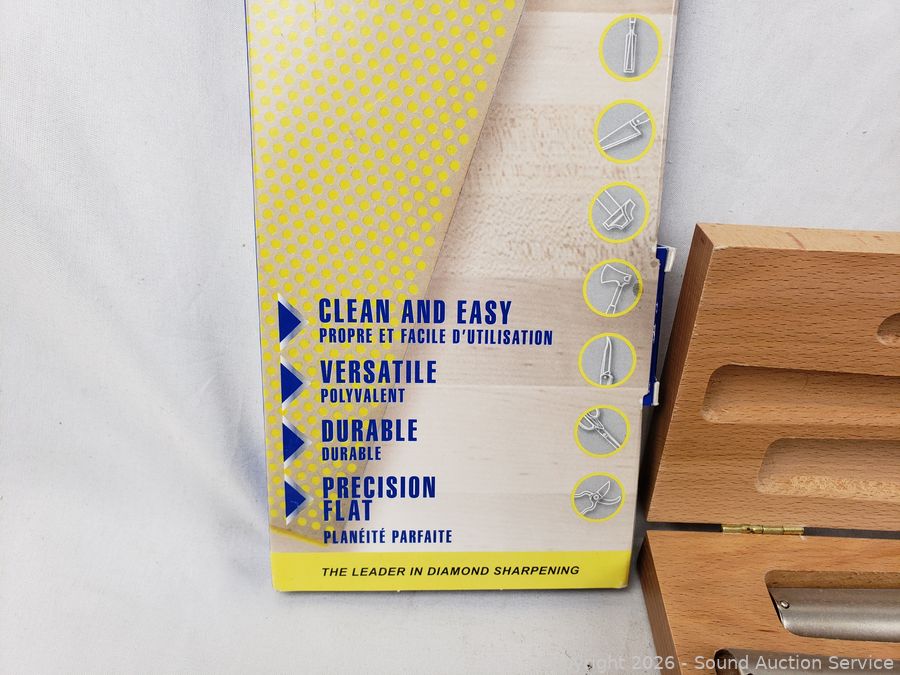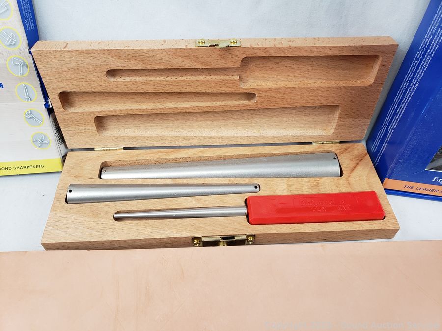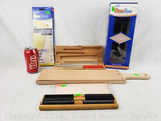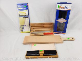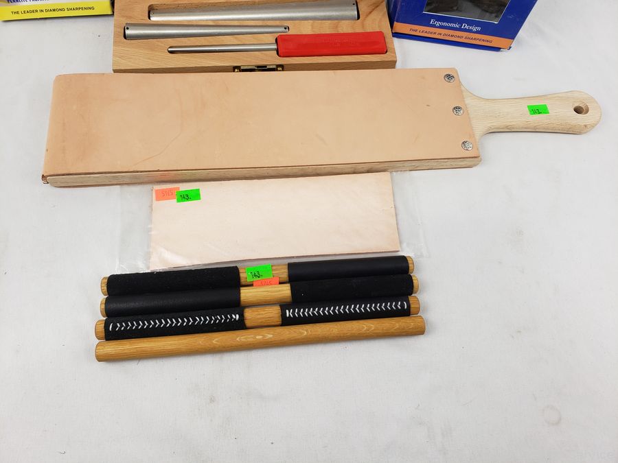 Paddle Leather Strop, Diamond Honing Cones, Duo Sharp Diamond Sharpener w/Base, Leather Honing Rods. Refer to photos for more details.