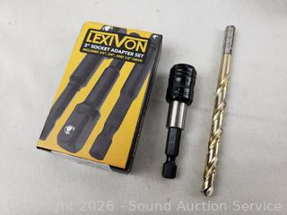 Comes with 2 batteries, charger, drill, socket adapters, manual.