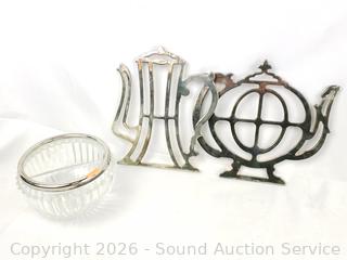 Countess pitcher, trivets, Sheridan & other dishes, horn handle leaf spatula, napkin ring set, 2 bell picks sets, utensils. Refer to photos for lot contents, more details.