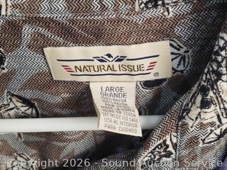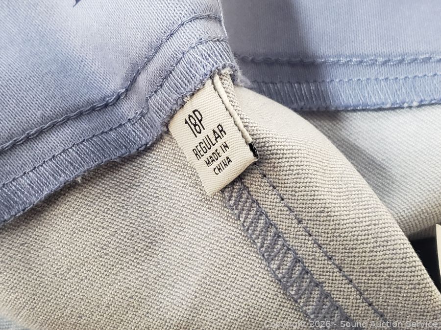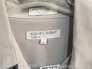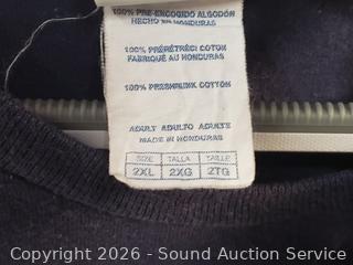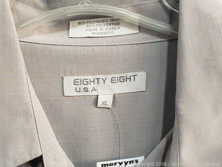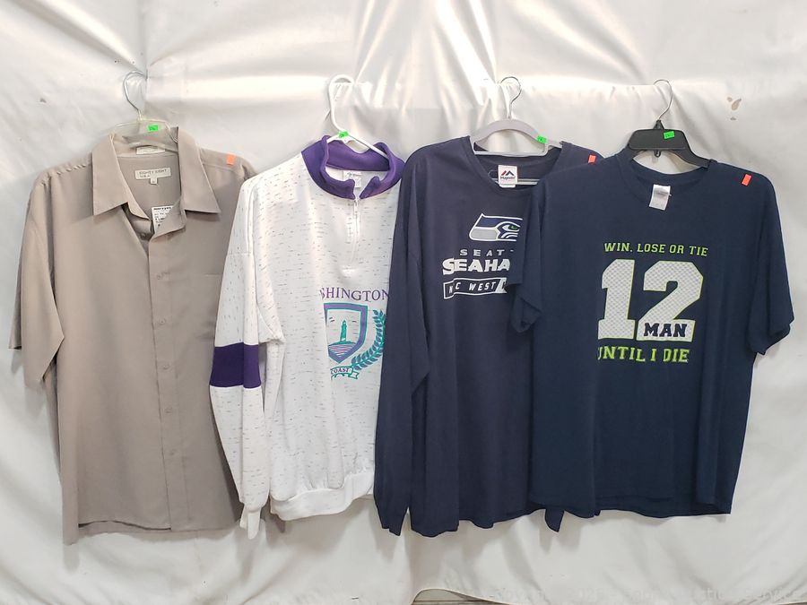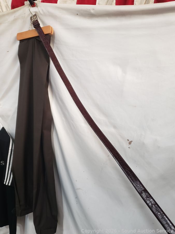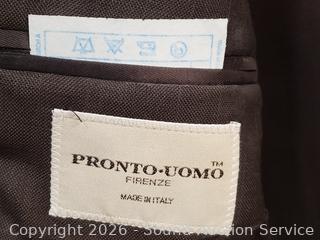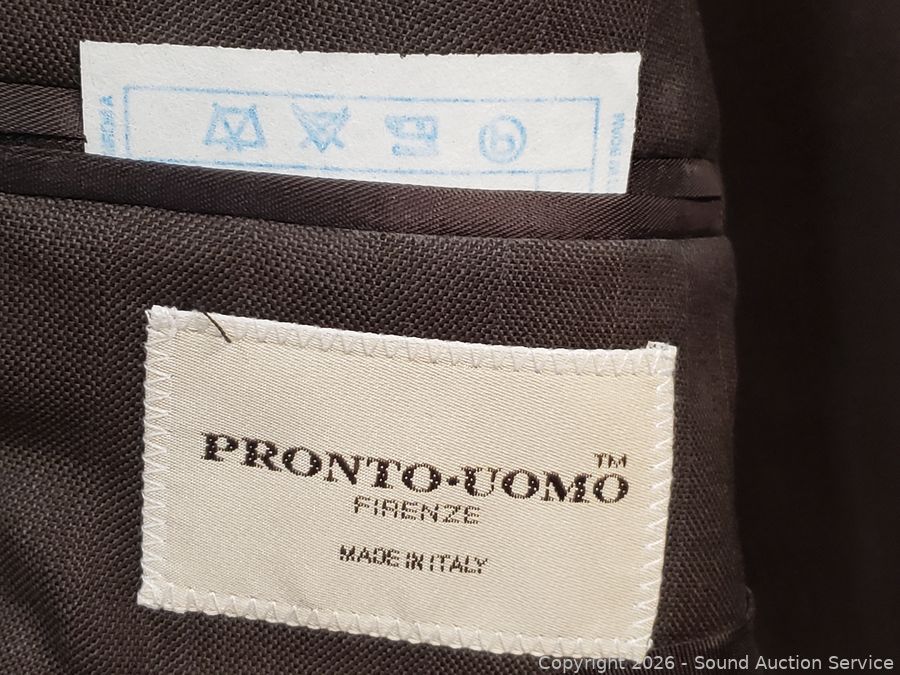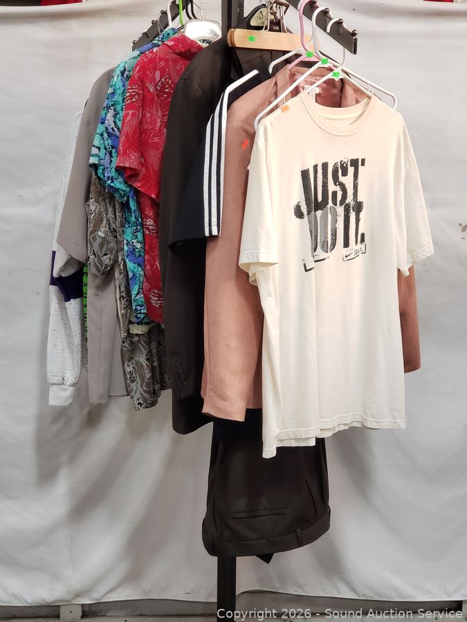 Sweater S:XXL, T-Shirts S:XL|2XL, Button Up Shirts S:L|XL, 2pc Pronto-Uomo Italy Suit S:46 Blazer, 40x30 Slacks, Balzer S:4, Pants S:18, etc. Refer to photos for lot contents, more details.