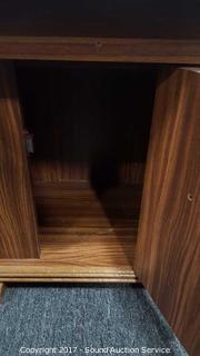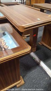 Beautifully hand crafted 2 tiers with glass top. Approx. 29.5" tall, 23" wide, 30" deep.
