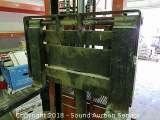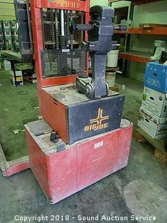 Battery powered, works good, chain driven, lifts about 6ft high & 2500 lbs. Serial 318390. Approx. 57" wide, 42" adjustable forks, 81" tall, overall 6'ft long.