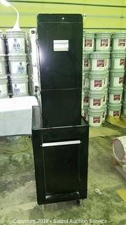 Locking with keys. Looks like mostly Craftsman tools, some Cobalt. Approx. 65" H, 27" L, 18" W.