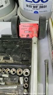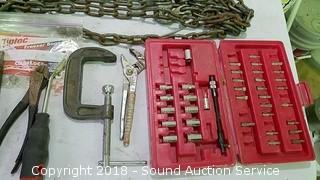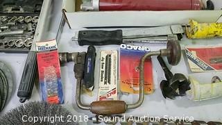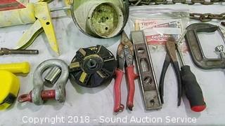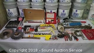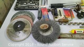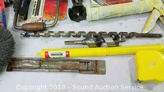 Includes: Hole Saw, Hole Saw bits, 7" cutting wheels, sockets, caulk gun, and more. EDIT:Come-A-Long has been removed from this Lot.