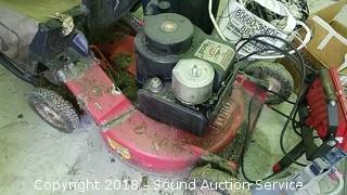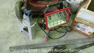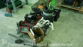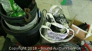 Lawn mower in unknown condition, shoplight, jack stand, pipe wrench, buckets, Power strip, come-a-long, moss control, volleyball net, strap & more.