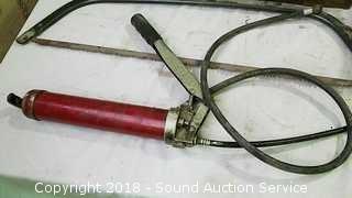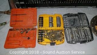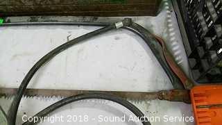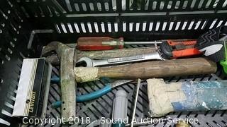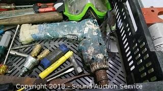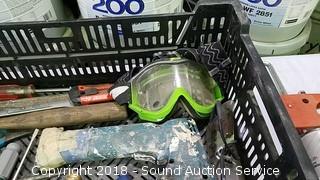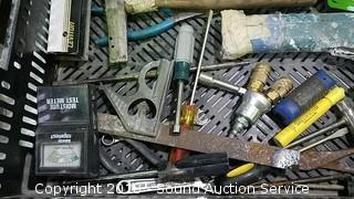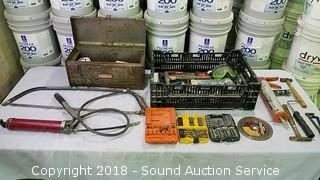 Grease gun, bow saw, goggles, bits, wrenches, 3 way air hose tap, and more.
