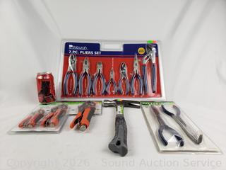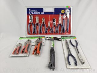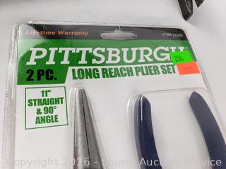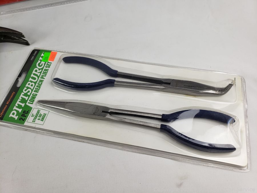 All like new condition. 2pc Long Reach Pliers, 7pc Plier Set, 3pc Lock Jaw Plier Set.