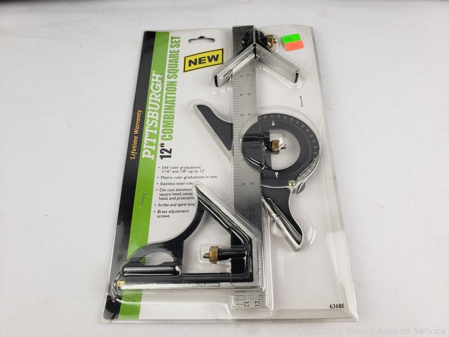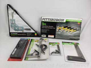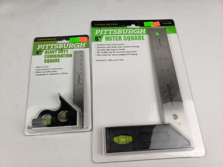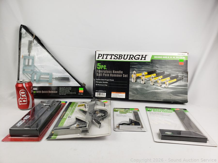 Cen-Tech 6" Digital Caliper, Pittsburgh 12" Combination Square Set, Pittsburgh 6" Combination Square, Pittsburgh 8" Miter Square, Pittsburgh Corner Clamp w/Quick Release, Pittsburgh Fiberglass Handle Ball Pein Hammer Set.