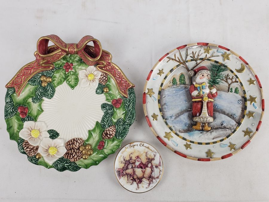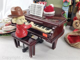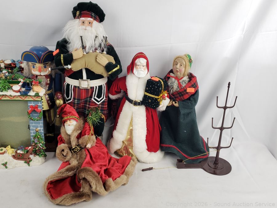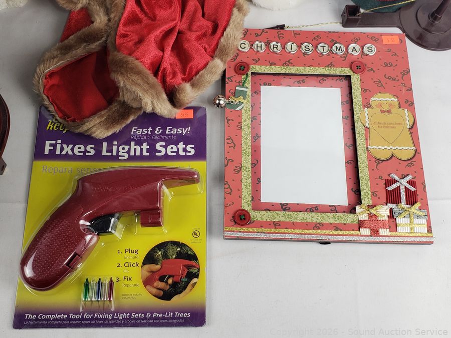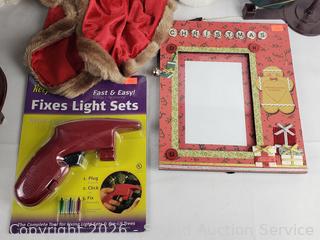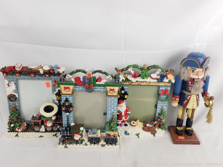 Decorative photo frames, string light repair tool, wood nutcracker, Santa figures, piano player figure & more. Refer to photos for lot contents, more details.