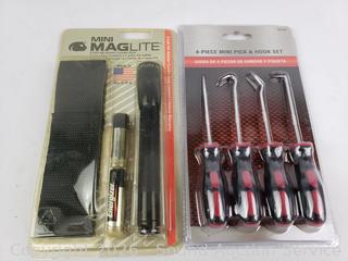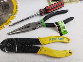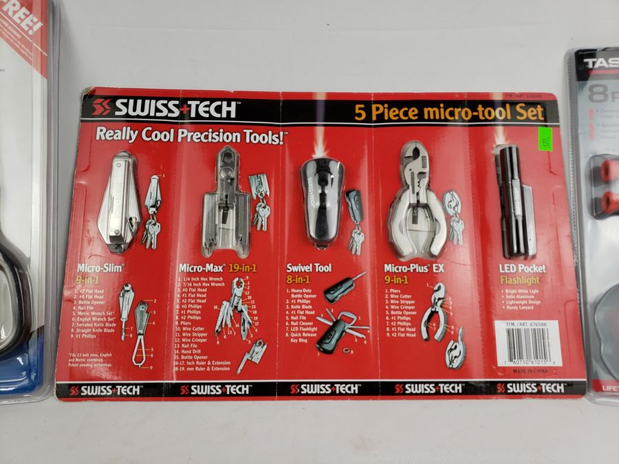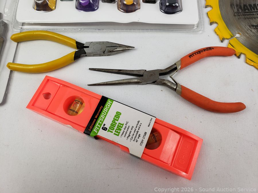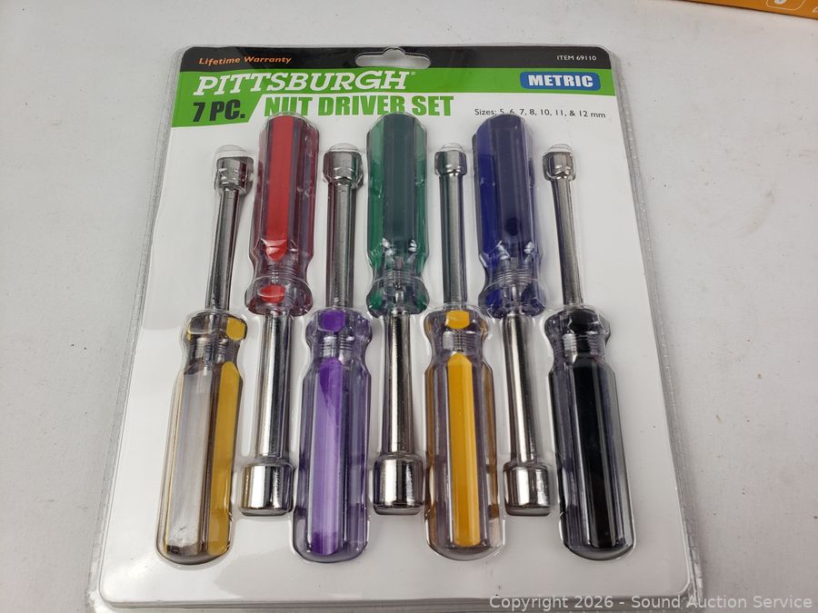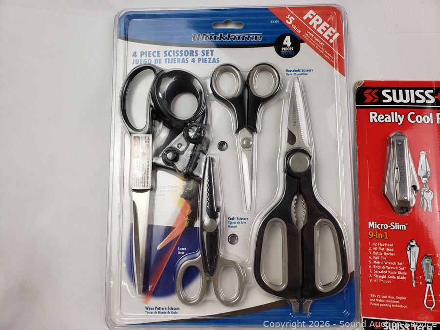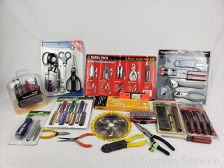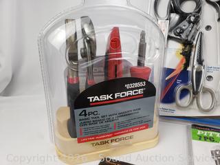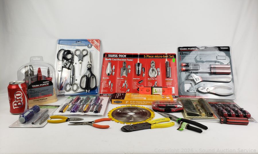 Pittsburgh 7pc Nut Driver Set, Swiss Tech 5pc Micro Tool Set, Workforce 4pc Scissors Set, 4pc Mini Pick & Hook Set, Warrior 10" SDS Masonry Chisel Set, Task Force Tool Set (missing some pieces, has been opened), 4pc Task Force Basic Tool Set, Mini Mag Lite, 4 in 1 Screwdriver & more. Refer to photos for lot contents, more details.