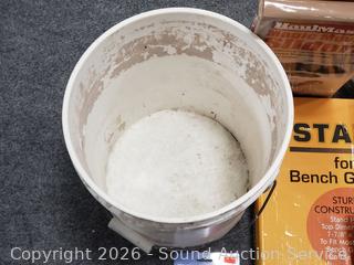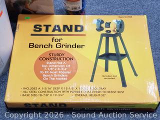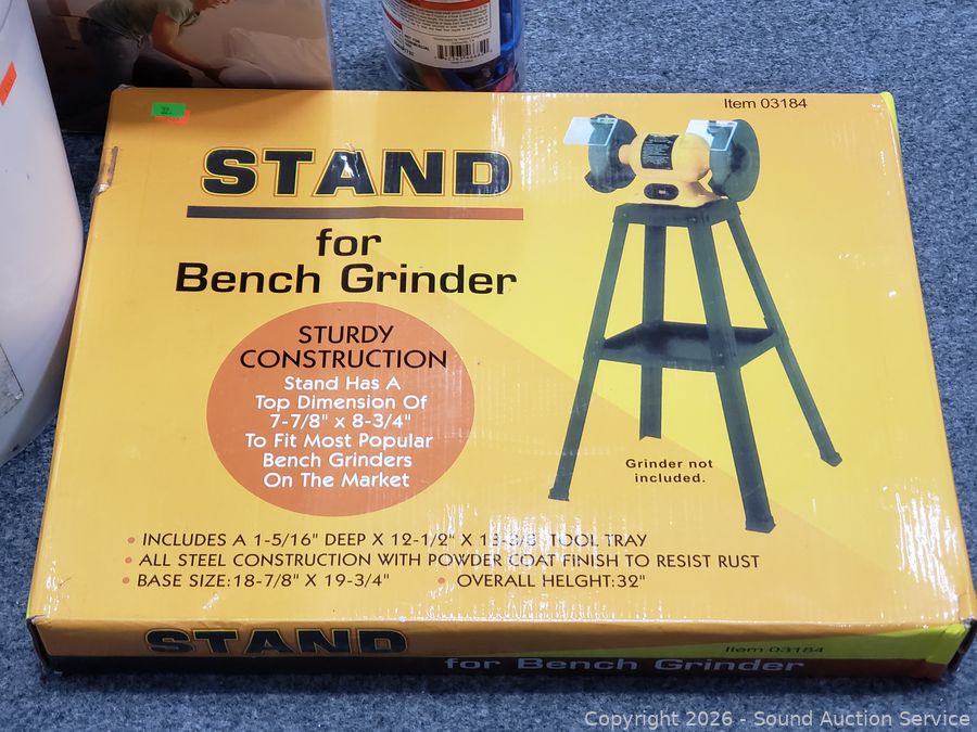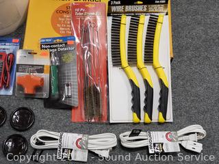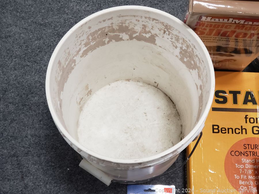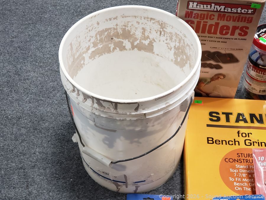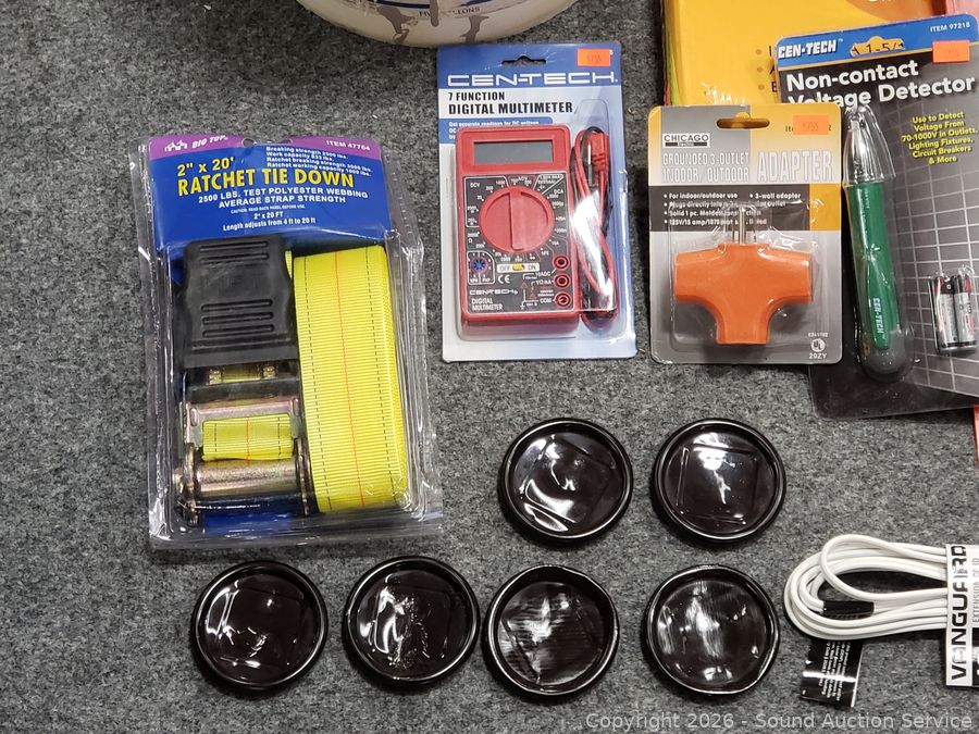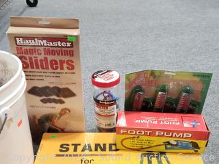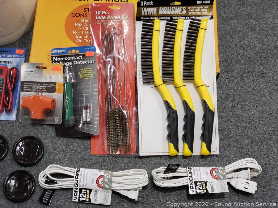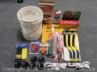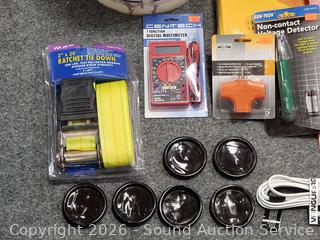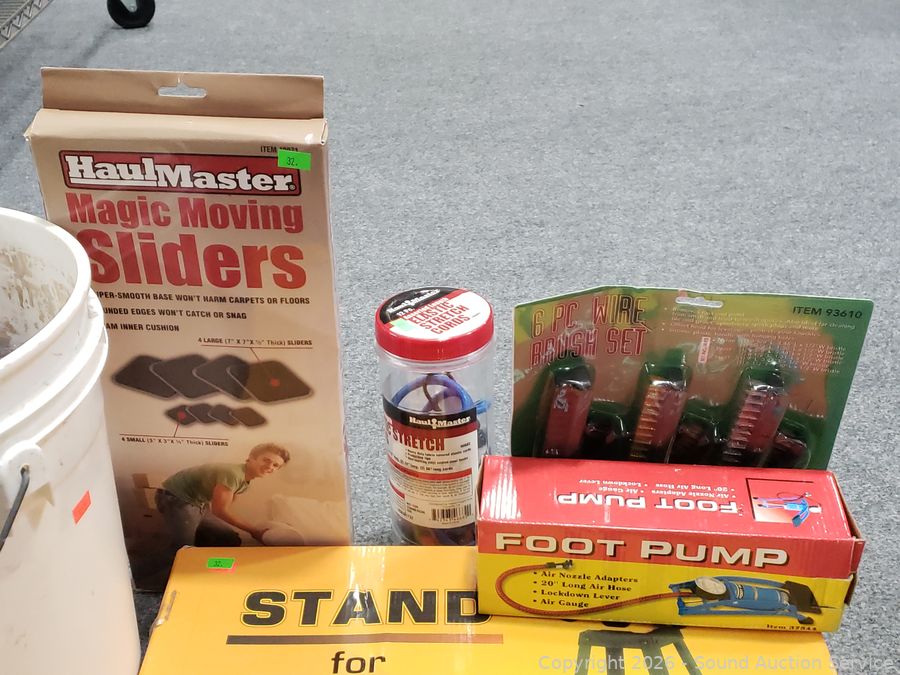 Bench grinder stand, foot air pump, magic moving sliders, wire brushes, 12ft extension cords, 2" x 20ft ratchet tiedowns, digital multimeter, voltage tester, 3-outlet adapter, 5-gallon bucket. All like new condition. Refer to photos for lot contents, more details.