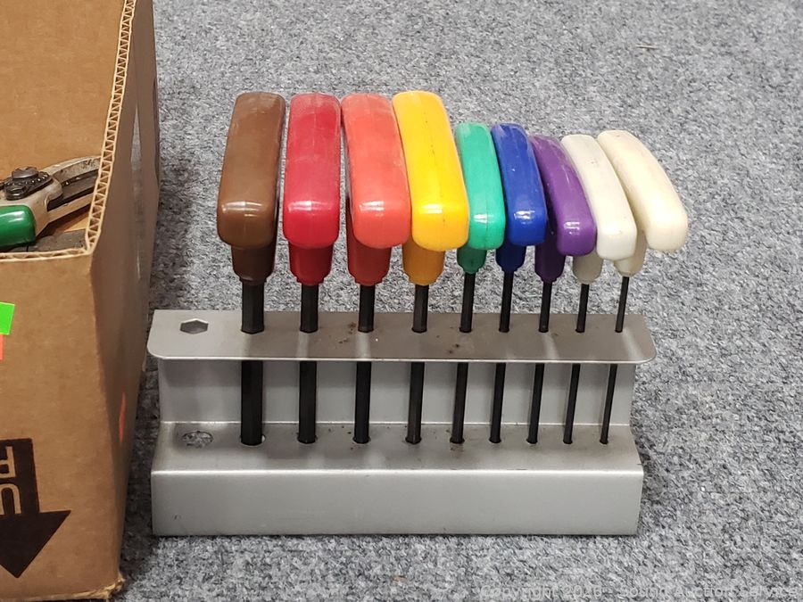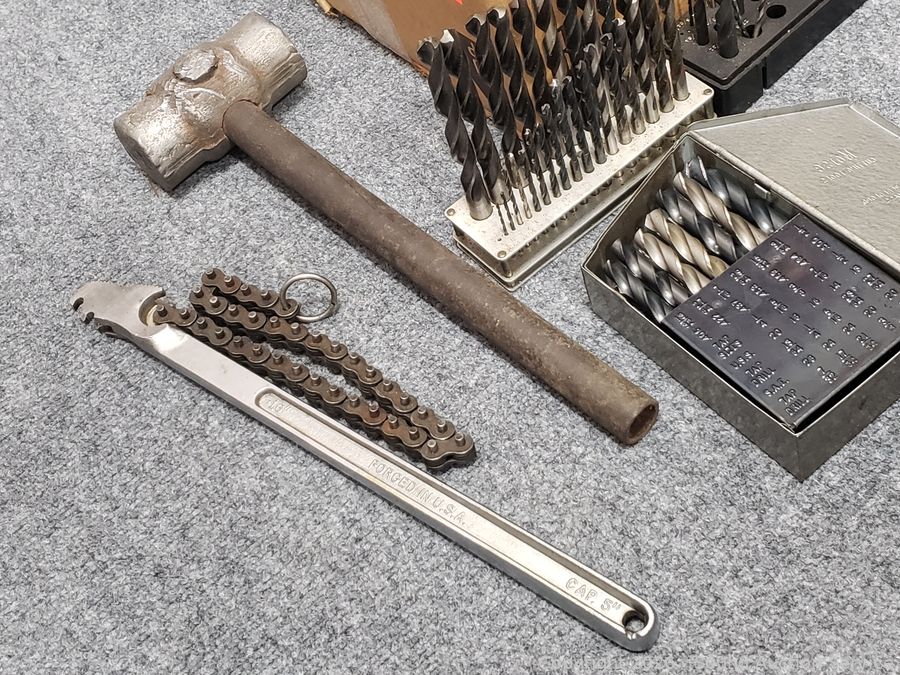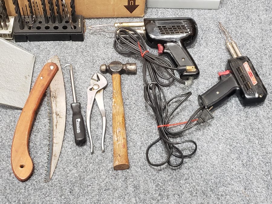 Aluminum block mallet, hex key set, Weller soldering gun, drill bit set, ballpeen hammer, etc. Refer to photos for lot contents, more details.