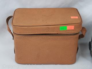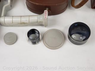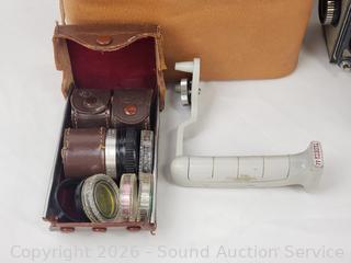 Both shutters, focus, viewing appear to be functioning properly otherwise untested. Case has a missing zipper pull. Comes with lenses, filters, adapters, handle, etc.