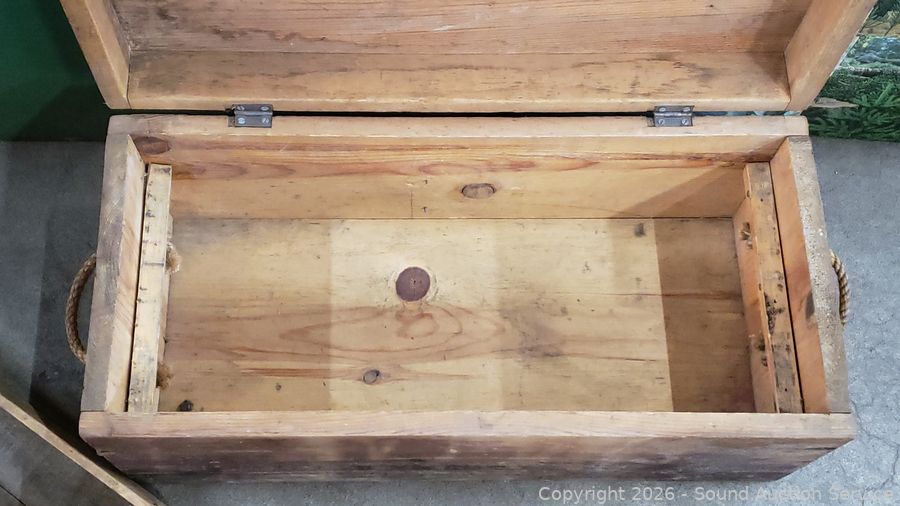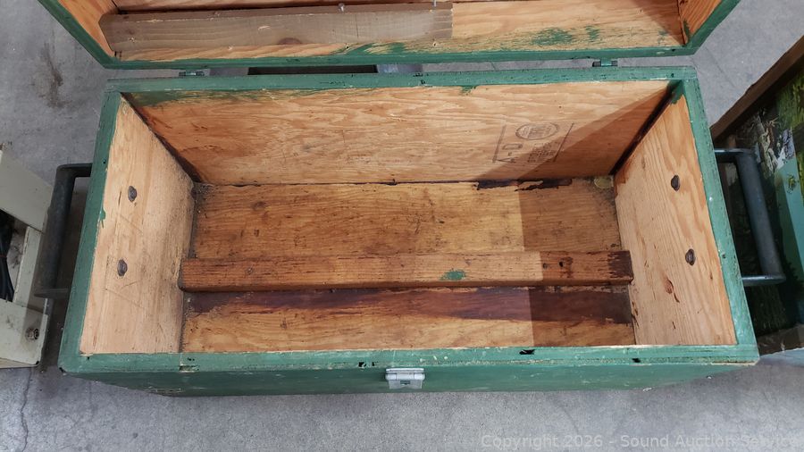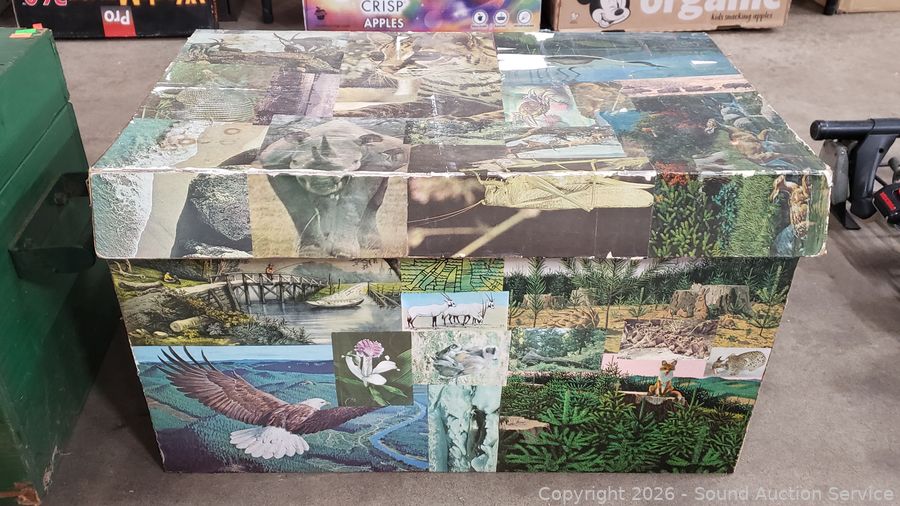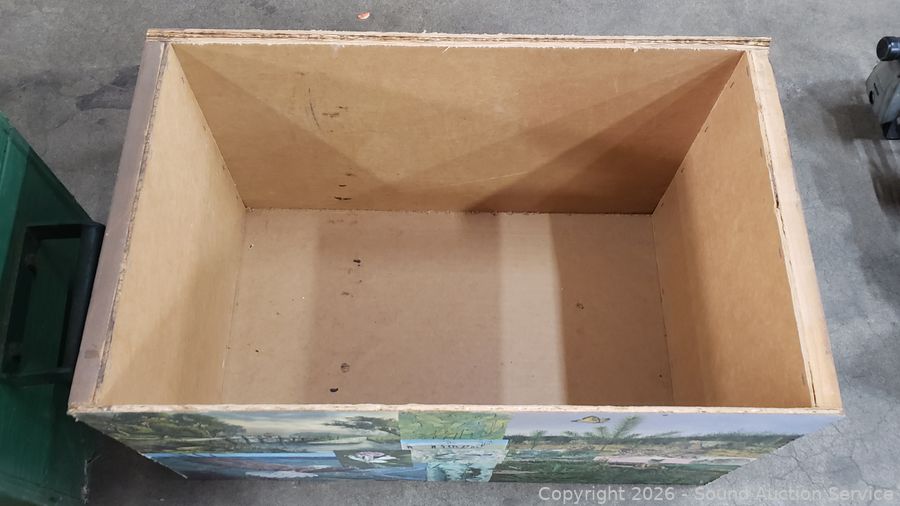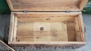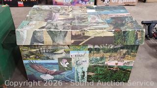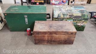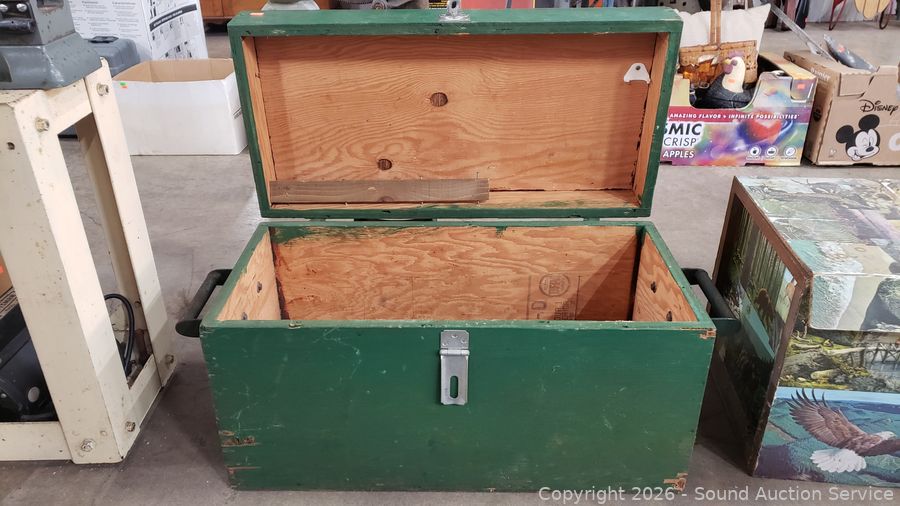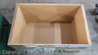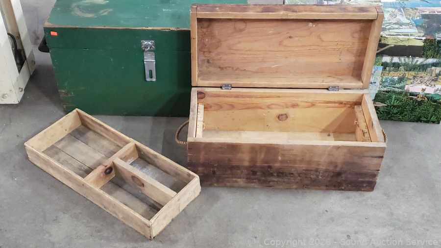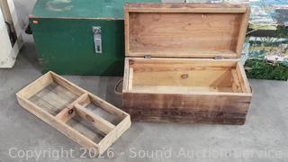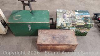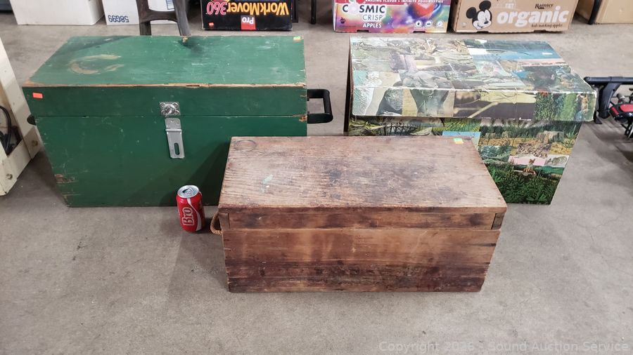 Natural wood toolbox, 10.75" H x 24" x 11.25". Animal print wood box, 14.75" x 24" x 14.5". Green Wood Box 15.75" H x 27.5" x 13.5".