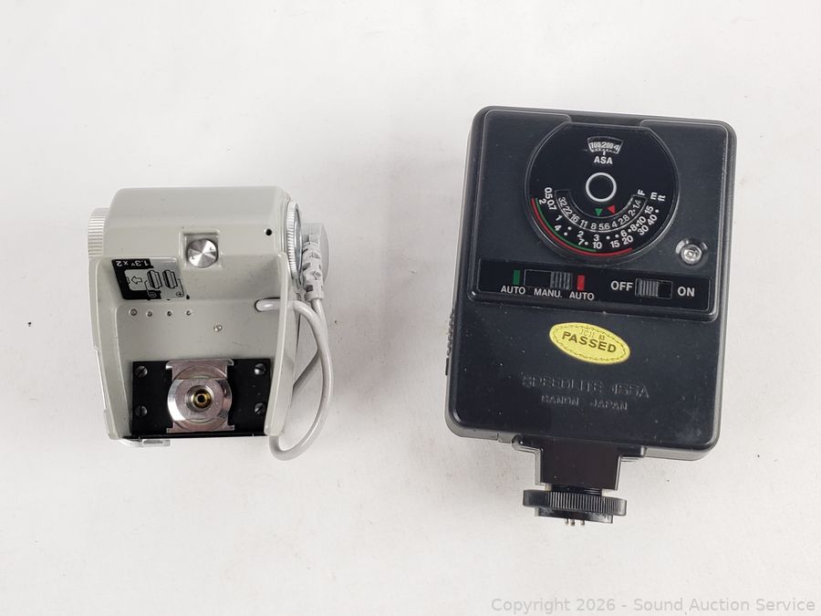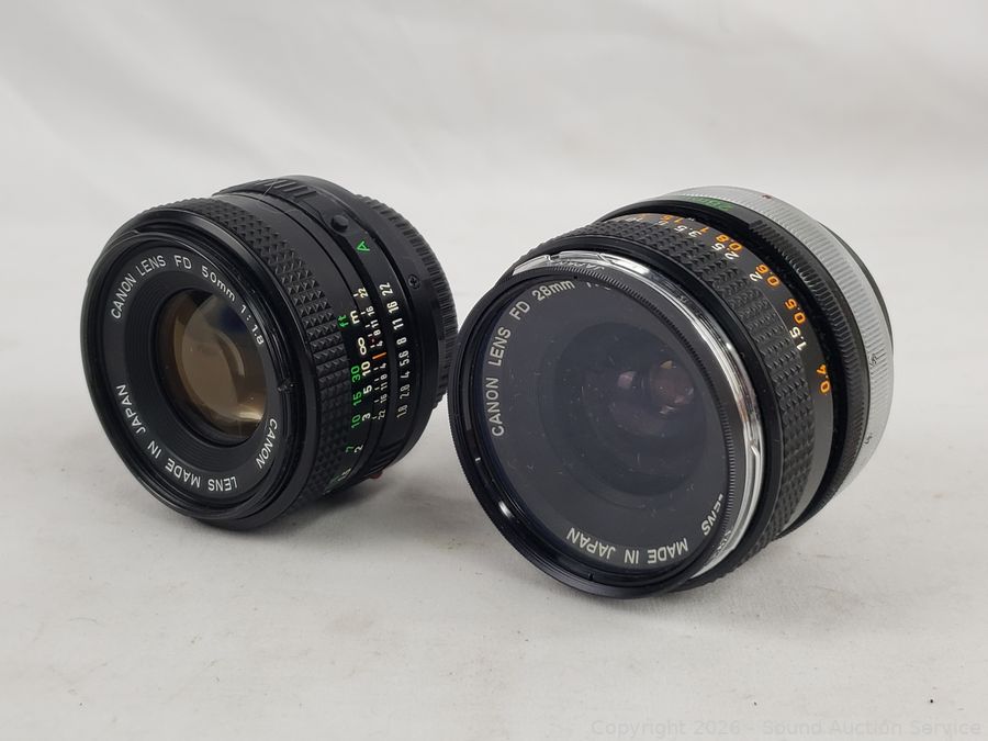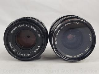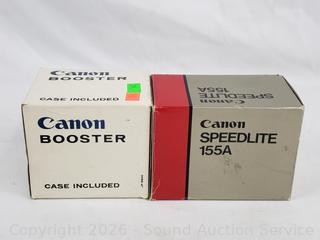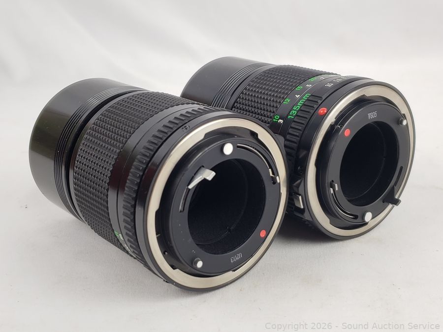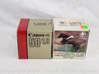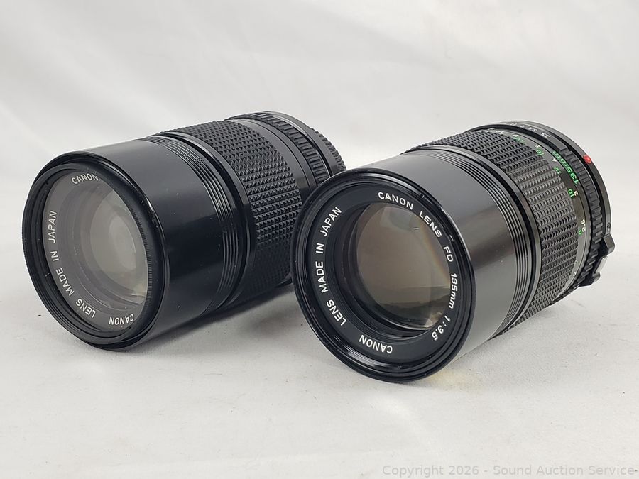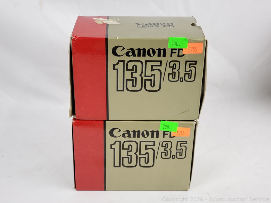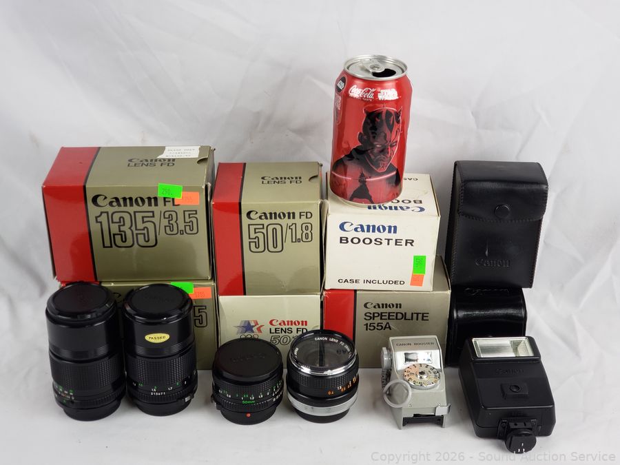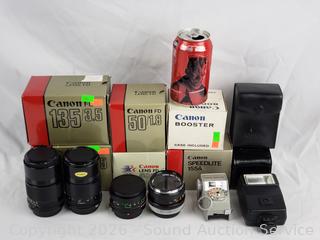 2 Canon 135/3.5, 2 Canon FD 50/1.8, Canon Booster, Canon Speedlite 155A. All with original boxes, appear to be in excellent condition, possibly never used.