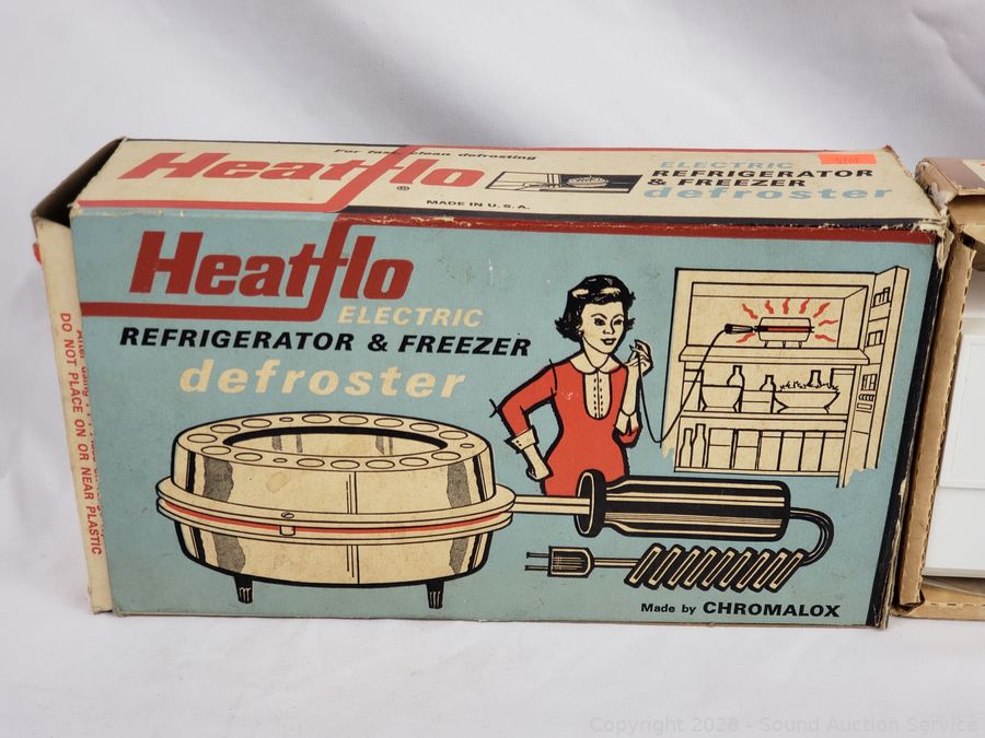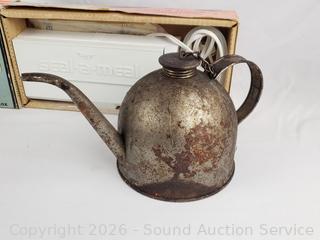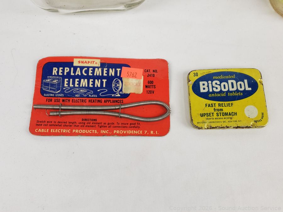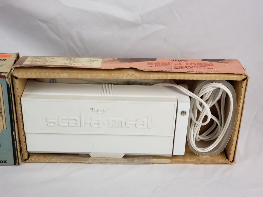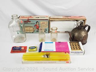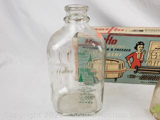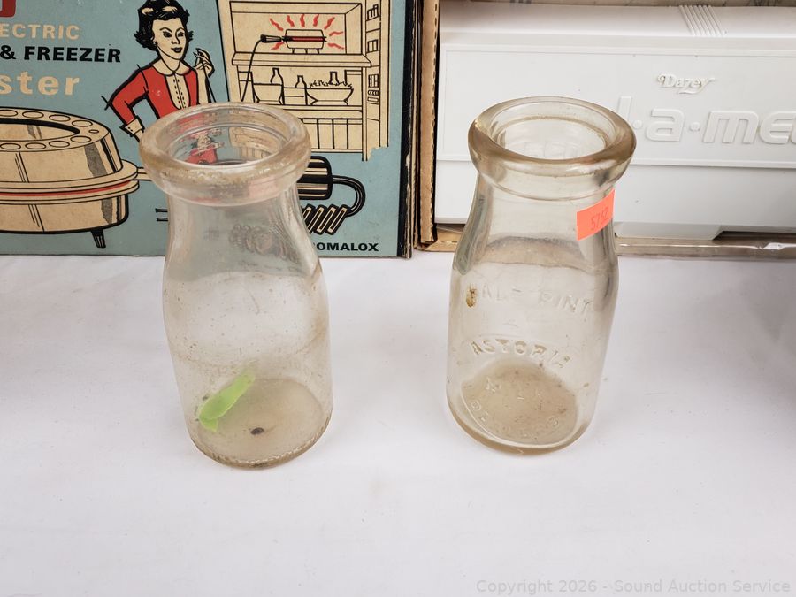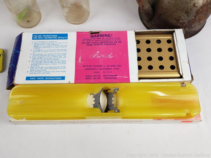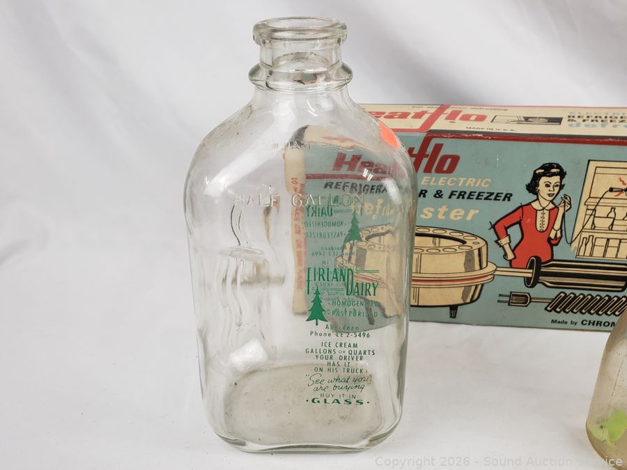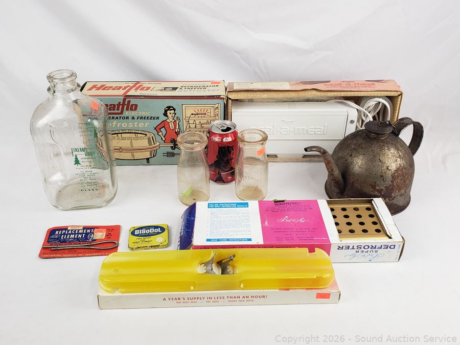 Electric refrigerator defroster (works), Sealer (has power/untested), oil can, glass gallon milk jug & bottles, corn cutter, etc.
