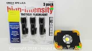 Lot #0023: 3-Pack High Intensity Flashlights & CAT Work Light