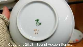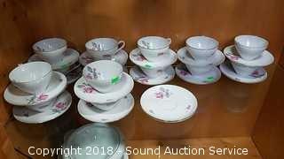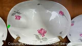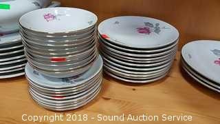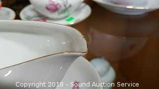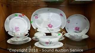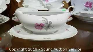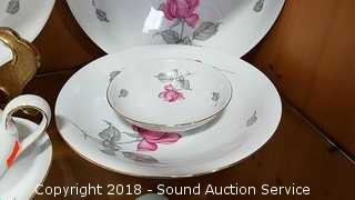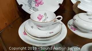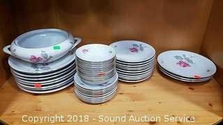 Includes: teacups and saucers, soup bowls, dinner plates, large salad bowl, sugar and creamer, gravy bowl, serving platter, dessert plates, soup tureen (missing the lid). Please refer to photos for more information.